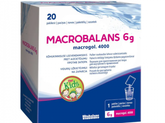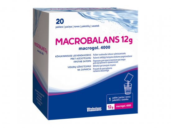<p>Makrogooli kasutamine on ohutu: see on sünteetiline, vett siduv aine, mis organismi ei omasta, vaid läbib muutumatul kujul soolestikku ja eritub koos väljaheitega. Kui makrogooli võtta koos veega, seob see allaneelatud vee endaga ja transpordib selle soolde. See ei seo kehast vedelikku. Kui soolesisu vee hulk suureneb, siis kõva väljaheide pehmeneb ja soolestik hakkab normaalselt funktsioneerima. WC-s käimine hakkab sujuma ilma valusa pingutuseta.</p> <p>MacroBalans on CE meditsiiniseade.</p> <p><strong>Tootja:</strong> Vitabalans OY</p> <p><strong>Päritoluriik: </strong>Soome</p>