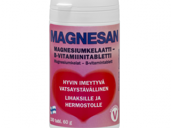 <p>*Magneesium on tähtis mineraalaine südamele, lihastele ja närvisüsteemile.<br /> *Magneesium aitab vähendada väsimust ja kurnatust,aitab kaasa närvisüsteemi ja lihaste normaalsele talitlusele ning normaalsele lihaste tööle.<br /> *Magneesium aitab hoida hambaid ja luid normaalsetena.<br /> <br /> Magnesan sisaldab magneesiumi kolme ühendina, mis toimivad soolestiku eri osades, mistõttu magnesium imendub täielikumalt.<br /> <br /> B-rühma vitamiinid tugevdavad magneesiumi toimet.</p> <p><strong>Netokogus: </strong>100tbl (60g)</p> <p><strong>Tootja:</strong> Hankintatukku OY, Karkkila, Soome</p> <p><strong>Esindaja:</strong> Loodustoode OÜ, Rabaküla 4/2, Tallinn</p>