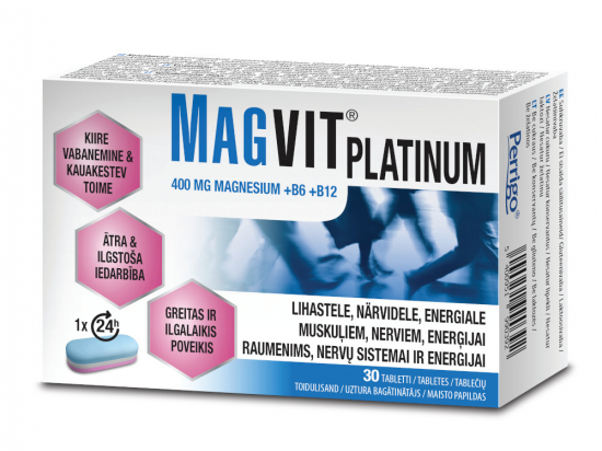 <p><span><span><span>MAGVIT PLATINUM 3-faasilisel tehnoloogial põhinev tablett varustab organismi magneesiumiga kolmel erineval moel ja võimaldab seetõttu magneesiumil toimida kiiresti ja kaua. Selles tootes kasutatav magneesium on magneesiumoksiidi ja diglütsinaadi segu. Diglütsinaat on tavaliste (anorgaaniliste) magneesiumiallikatega võrreldes kõrgema biosaadavusega (ja seega hea imendumisega) magneesiumi orgaaniline allikas.</span></span></span></p> <p><span><span><span>Magneesium toetab lihaskonna normaalset funktsiooni, aitab vähendada väsimust ja kurnatust ning aitab kaasa närvisüsteemi normaalsele talitlusele.</span></span></span></p> <p><span><span><span>Vitamiin B12 toetab normaalset energiaainevahetust. </span></span></span></p>