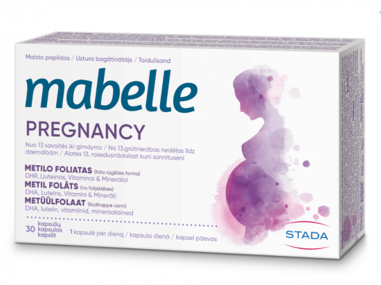 <p>MABELLE Pregnancy Toidulisand</p> <p>Metüülfolaat (foolhappe vorm)│DHA, luteiin, vitamiinid, mineraalained</p> <p>Alates 13. rasedusnädalast kuni sünnituseni</p> <p>Aitab varustada teie keha oluliste ainetega, mida organism vajab alates teisest trimestrist (alates 13. rasedusnädalast) kuni raseduse lõpuni. Toetab teie tervist ja teie lapse tervislikku arengut.</p> <p><strong>Folaat </strong>aitab kaasa kudede kasvule naise organismis raseduse ajal, samuti aitab kaasa normaalsele vereloomele ja osaleb rakujagunemise protsessis.</p> <p>Foolhappe täiendaval kasutamisel suureneb folaatide sisaldus raseda vere erütrotsüütides. Madal folaaditase punastes verelibledes rasedatel naistel on areneva loote neuraaltoru defektide riskitegur. Positiivne efekt ilmneb 400 μg foolhappe igapäevasel lisatarbimisel vähemalt üks kuu enne rasestumist ja kuni kolm kuud pärast rasedaks jäämist. </p> <p><strong>Dokosaheksaeenhape (DHA) </strong>aitab säilitada normaalset ajutalitlust. Kasulik toime avaldub siis, kui päevas tarbitakse 250 mg DHA-d.</p> <p><strong>Jood </strong>aitab kaasa kilpnäärmehormoonide normaalsele tootmisele ja normaalsele kilpnäärmetalitlusele.</p> <p><strong>Netokogus</strong><br /> 42,6g (30 kapslit)<br /> <br /> <strong>Tootja, pakendaja, turustaja</strong><br /> Tootja: WALMARK, a.s., Oldřichovice 44, 739 61 Třinec, Tšehhi<br /> Turustaja: UAB „STADA Baltics“, Goštauto g. 40A, Vilnius, Leedu<br /> <br /> <strong>Päritoluriik</strong><br /> Tšehhi</p>
