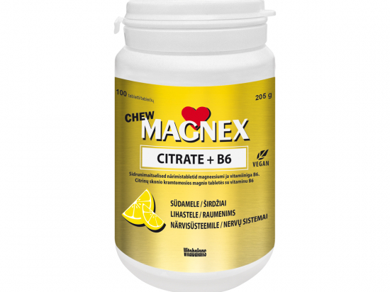 <p>Värske sidruni maitsega närimistabletid.<br /> <br /> Magneesium aitab kaasa närvisüsteemi ja lihaste normaalsele talitlusele.<br /> Magneesium ja Vitamiin B6 aitavad vähendada väsimust ja kurnatust ning aitavad kaasa normaalsetele psühholoogilistele funktsioonidele.</p> <p><strong>Netokogus: </strong>205g</p> <p><strong>Tootja:</strong> Vitabalans OY, Soome</p>