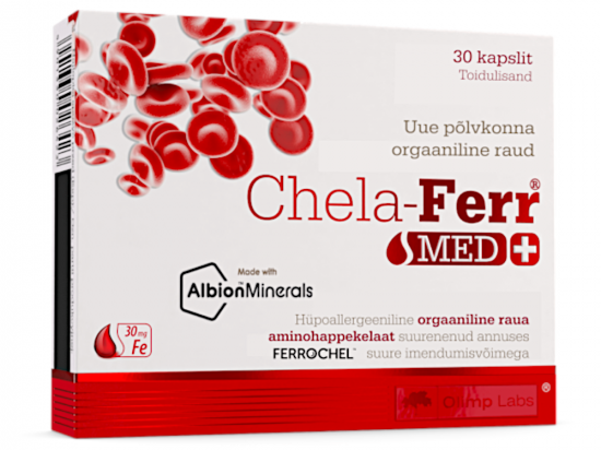 OlimpLabs Chela-Ferr MED 30mg N30 Tootekood: 590133002642 GTIN: 5901330026423 Raud <p>Uue põlvkonna orgaaniline raud - raua<br /> aminohappekelaat - Ferrochel® suurendatud<br /> annustes - tõhus ja hästi talutav rauavorm on ohutu rauaallikas, et säilitada normaalne raua tase ja vähendada rauavaegust.<br /> <br /> Ferrochel® on ainulaadne orgaaniline raua-aminohappe ühend:<br /> *kõrge imendumisvõime ja kõrge bioefektiivsus, mis isegi väikeste annuste korral suurendab kiiresti rauavarusid kehas;<br /> *kontrollitud imendumine organismis, mis hoiab ära üleannustamise võimaluse;<br /> *hea talutavus - ei põhjusta seedetrakti ärritust;<br /> *ohutu kasutada – hüpoallergeenne ;<br /> *toit ja muud vitamiinid/mineraalid ei mõjuta raua imendumist – neid võib võtta igal ajal ja koos teiste vitamiinide/mineraalidega;<br /> <br /> Raud:<br /> *aitab kaasa punaste vereliblede ja hemoglobiini normaalsele moodustumisele ning aitab kaasa hapniku normaalsele transpordile kehas;<br /> *aitab kaasa normaalsele kognitiivsele talitlusele ja normaalsele energiavahetusele, aitab kaasa immuunsüsteemi normaalsele talitlusele ning aitab vähendada väsimust ja kurnatust.<br /> <br /> C vitamiin parandab raua imendumist.</p> <p><span><span><span>Netokogus: 11,6 g</span></span></span></p> <p><span><span><span>Tootja<strong>:</strong> Olimp Laboratories Sp.z.o.o., EU</span></span></span></p> <p><span><span><span>Turustaja<strong>: </strong>VitalMedica SIA</span></span></span></p> | in stock | 12,80 € −4,91 € | Poodi | |