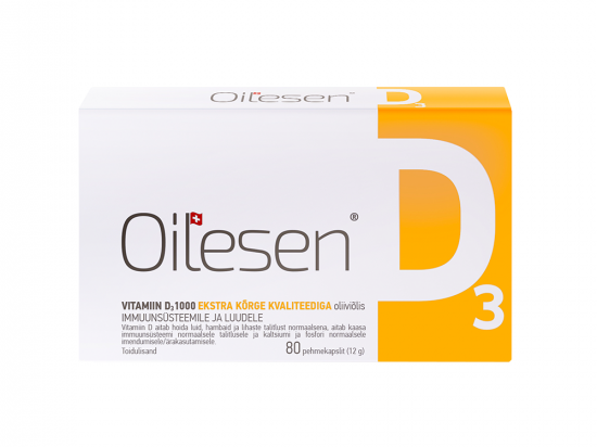 Oilesen Vitamiin D3 1000 pehmekapslid N80 Tootekood: 764015306052 GTIN: 7640153060525 Vitamiin D <p>Vitamiin D aitab hoida luid, hambaid ja lihaste talitlust normaalsena, aitab kaasa immuunsüsteemi normaalsele talitlusele ja kaltsiumi ja fosfori normaalsele imendumisele/ärakasutamisele.</p> <p>D-vitamiin toetab laste luustiku normaalset kasvu ja arengut.</p> <p><strong>Netokogus: </strong>80 pehmekapslit, 12g</p> <p><span><span><span><strong>Turustaja:</strong> Valentis Baltic UAB</span></span></span></p> <p><span><span><span><strong>Tootja, pakendaja: </strong>Valentis AG, CH-6982 Agno-Lugano, Šveits</span></span></span></p> <p><span><span><span><strong>Päritoluriik:</strong> Euroopa Liit</span></span></span></p> | in stock | 8,19 € −0,68 € | Poodi | |