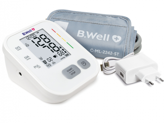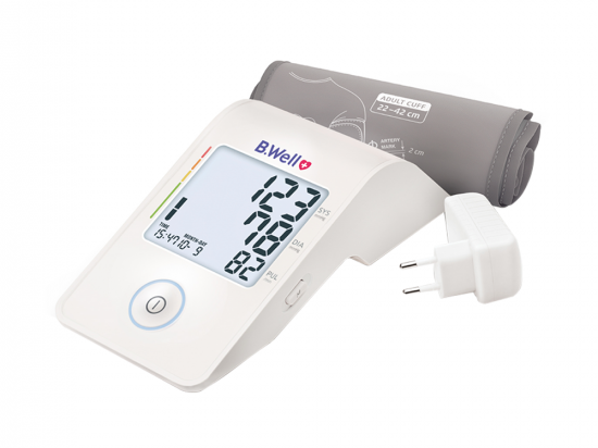B.Well PRO-22 automaatne vererõhumõõtja N1 Tootekood: 764015639890 GTIN: 7640156398908 Automaatsed vererõhumõõtjad <p><strong>Automaatne vererõhumõõtja PRO-22</strong></p> <ul> <li> <p><strong>Manseti paigaldus- ja liikumisindikaator</strong> – kuvab, kui mansett on õigesti asetatud; vale paigaldus näidatakse veasümboliga.</p> </li> <li> <p><strong>Vererõhu taseme skaala</strong> – vastab Euroopa Hüpertensiooni Seltsi (ESH) klassifikatsioonile.</p> </li> <li> <p><strong>Arütmia indikaator</strong> – tuvastab ebaregulaarse südamerütmi.</p> </li> <li> <p><strong>Anatoomiline mansett</strong> – tagab mugava ja täpse mõõtmise.</p> </li> <li> <p><strong>Universaalne M–L mansett (22–42 cm)</strong> – sobib erineva suurusega õlavarrele.</p> </li> <li> <p><strong>Mälu kuni 99 mõõtmist</strong> – salvestab kuupäeva ja kellaaja.</p> </li> <li> <p><strong>Eemaldatav mansetikate</strong> – lihtsustab puhastamist, on pestav.</p> </li> <li> <p><strong>USB-C toitekaabel ja adapter</strong> – alati käepärast.</p> </li> <li> <p><strong>Hoiukott</strong> – mugav säilitamiseks ja transportimiseks.</p> </li> <li> <p><strong>Patarei tühjenemise indikaator</strong></p> </li> <li> <p><strong>Automaatne väljalülitus</strong></p> </li> </ul> | in stock | 26,99 € −9,00 € | Poodi | |