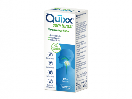 <p>Seetõttu aitab Quixx® taastada ninafunktsioone, mille tulemusena väheneb tüsistuste (sinusiit, otiit) risk ja paraneb nina kaudu hingamine. Sisaldab ainult looduslikke koostisosi. Ei sisalda säilitusaineid. Ei tekita sõltuvust. Pikaajalisel kasutamisel ohutu. Võib kasutada raseduse ja imetamise ajal.</p> <p>Looduslik abivahend nina- ja põskkoobaste kinnisuse leevendamiseks, niisutab tundlikku ninalimaskesta. 100 ml sisaldab 84,6 ml naturaalset merevett, 15,4 ml puhastatud vett.</p> <p><strong>Hoiatused ja ettevaatusabinõud</strong><br /> Ärge kasutage, kui teil on ülitundlikkus (allergia) merevee suhtes.<br /> <br /> <strong>Säilitamistingimused</strong><br /> Säilitada toatemperatuuril. Hoida laste eest varjatud ja kättesaamatus kohas.<br /> <br /> <strong>Seadme ja pakendi sisu</strong><br /> Quixx® on saadaval 30 ml spreid sisaldavas pudelis. Iga pudel sisaldab umbes 220 annust.<br /> <br /> <strong>Tootja või tootja volitatud esindaja</strong><br /> OÜ Berlin-Chemie Menarini Eesti, Paldiski mnt. 29, 10612 Tallinn, Eesti.<br /> <br /> <strong>Päritoluriik</strong><br /> Prantsusmaa</p>