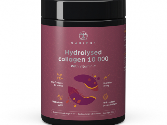 SAPIENS Hüdrolüüsitud kollageen 10 000 330 g Tootekood: 477905239026 GTIN: 4779052390266 Lihastele, liigestele ja luudele <p><img alt="Uuenduslik viis täiendada dieeti kollageeniga!" src="https://www.sapiensvitamiinid.ee/photos/content/161_Kolagenas_hidro_vertes_img.jpg" style="height:412px; width:576px" /></p> <h3>Uuenduslik viis täiendada dieeti kollageeniga!</h3> <ul> <li>Tagatud soovitatud päevane 10 g kollageeni kogus!</li> <li>Kinnitatud päritolu - Peptan® kollageen.</li> <li>Koos C-vitamiiniga - paremaks kollageeni imendumiseks.</li> <li>C-vitamiin - nahale, immuunsusele ja energiavahetusele.</li> <li>Piisab terveks kuuks!</li> <li>Lahustuvat passionimaitselist maitsepulbrit saate segada vees või külmas joogis.</li> </ul> <p>Kasu:</p> <ul> <li>Koguni 10 g kollageeni portsjoni kohta – optimaalne päevanorm;</li> <li>I ja III tüüpi puhastatud loomse päritoluga kollageen;</li> <li>Täiendatud C-vitamiiniga – kollageeni paremaks imendumiseks.</li> <li>Mugav annus - pakendist leiate doseerimislusika;</li> <li>Lahustuv passionimaitseline pulber;</li> <li>Sobib segamiseks veega, mahlade, külmade jookidega;</li> <li>Sobib suurepäraselt jogurti maitsestamiseks rohelistes smuutides;</li> <li>Ühest pakist piisab üheks kuuks;</li> <li>Sisaldab turuliidri lyderio Peptan® kollageeni.</li> </ul> <p>SAPIENS Hüdrolüüsitud kollageen 10 000 toidulisand, mis on toodetud ilma geneetiliselt muundatud tooteid (GMOd) kasutamata. Samuti ei sisalda see allergiliste omadustega gluteeni ja rasva. Toidulisandil on mahe passioni maitse, mis teeb selle võtmise meeldivaks. 330 g pakend sisaldab annustamislusikat, mis muudab toidulisandi äärmiselt hõlpsasti doseeritavaks, tagades optimaalse päevase annuse 10 g kollageeni, millest piisab terveks kuuks.</p> <p><strong>Netokogus:</strong> 330g</p> <p><strong>Tootja ja turustaja:</strong> Nature Labs UAB, Leedu</p> | in stock | 20,19 € | Poodi | |