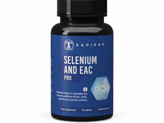 SAPIENS Seleen & EAC Pro tabletid N90 Tootekood: 477905239037 GTIN: 4779052390372 Universaalsed tooted nahale, juustele ja küüntele <p>Me kõik teame, et hoolitseda tuleb mitte ainult välimuse eest. Seleen on element, mida igaüks, kes soovib hoolitseda oma ilu eest, peaks lisama oma igapäevasesse dieeti.</p> <p>Seleen aitab säilitada juuste normaalset seisundit ja küünte normaalset seisundit.</p> <p>Sama olulised on vitamiinid E, A ja C. A-vitamiin aitab säilitada naha normaalset seisundit, samas kui C-vitamiin aitab säilitada normaalset kollageeni moodustumist, mis on vajalik naha normaalseks toimimiseks. Samal ajal aitab E-vitamiin kaitsta rakke oksüdatiivsete kahjustuste eest.</p> <p>Kahtlemata on väga oluline pidevalt säilitada tugev immuunsus (C-vitamiin, seleen, A-vitamiin aitavad säilitada immuunsüsteemi normaalset toimimist), samuti hoolitseda keha muude oluliste funktsioonide eest. Seleen on oluline nii naistele kui meestele, kuna see aitab säilitada normaalset kilpnäärme funktsiooni, aitab kaitsta rakke oksüdatiivsete kahjustuste eest ja aitab säilitada normaalset spermatogeneesi. A-vitamiin aitab säilitada normaalset nägemist, C-vitamiin aitab säilitada kollageeni normaalset moodustumist, mis on vajalik veresoonte, luude, kõhre, igemete, hammaste normaalseks toimimiseks.</p> <p>A-vitamiin aitab säilitada normaalset raua ainevahetust, aitab säilitada limaskestade normaalset seisundit ja täidab teatud funktsiooni rakkude spetsialiseerumisel. Neile, kellel on energiapuudus, aitab C-vitamiin säilitada normaalset energia ainevahetust ja neil, kellel on närvipinge, aitab C-vitamiin säilitada normaalset närvisüsteemi funktsiooni ja aitab säilitada normaalset psühholoogilist funktsiooni. C-vitamiin aitab ka vähendada väsimustunnet ja kurnatust, parandab raua imendumist ja aitab taastada E-vitamiini vähendatud kujul.</p> <p>SAPIENS Seleenium ja EAC PRO toidulisand sisaldab koguni 220 μg seleeni, mis on 4x päevane norm. </p> <p><strong>Netokogus:</strong> 90 tabletti</p> <p><strong>Tootja ja turustaja:</strong> Nature Labs UAB, Leedu</p> | in stock | 8,24 € | Poodi | |