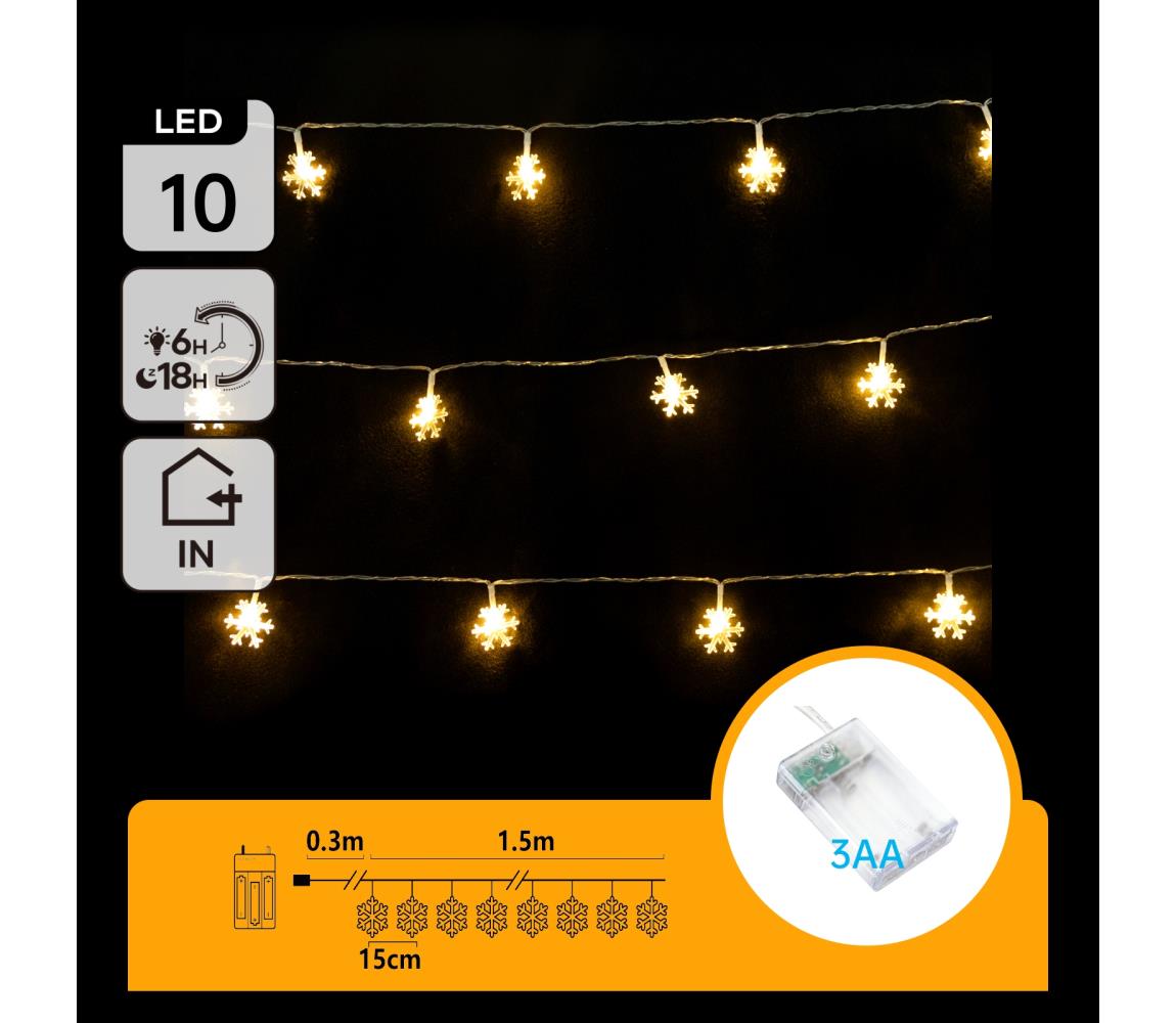 Välitingimustes kasutamiseks mõeldud dekoratiivne LED-valgusketi. Sobib siseruumides kasutamiseks. Madala valgusintensiivsuse tõttu sobib see eelkõige dekoratiivvalgustiks. Taimerifunktsioon - 6 tundi sisse/18 tundi välja. LED-dioodide arv: 10. Valgustatud kaabli pikkus: 1,5 m. Toitekaabli pikkus: 0,3 m. Valguse värvus: soe valge. Toiteallikas: 3×AA patareid (patareid ei kuulu komplekti).