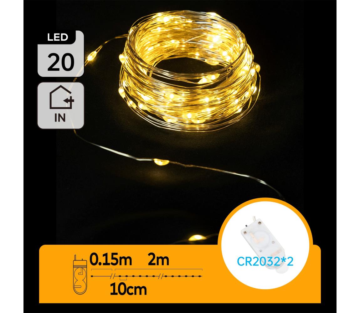 Jõuluaegne ketti, mis sobib suurepäraselt jõulueheteks. Sobib sise kasutamiseks. Kuna valguse intensiivsus on madal, kasutatakse seda dekoratiivse valgustina. LED dioodide arv: 20. Valgustatud kaabli pikkus: 2 m. Toitekaabli pikkus: 0,3 m. Valguse värv: soe valge. Toide: 3xAA patareid (ei kuulu komplekti).