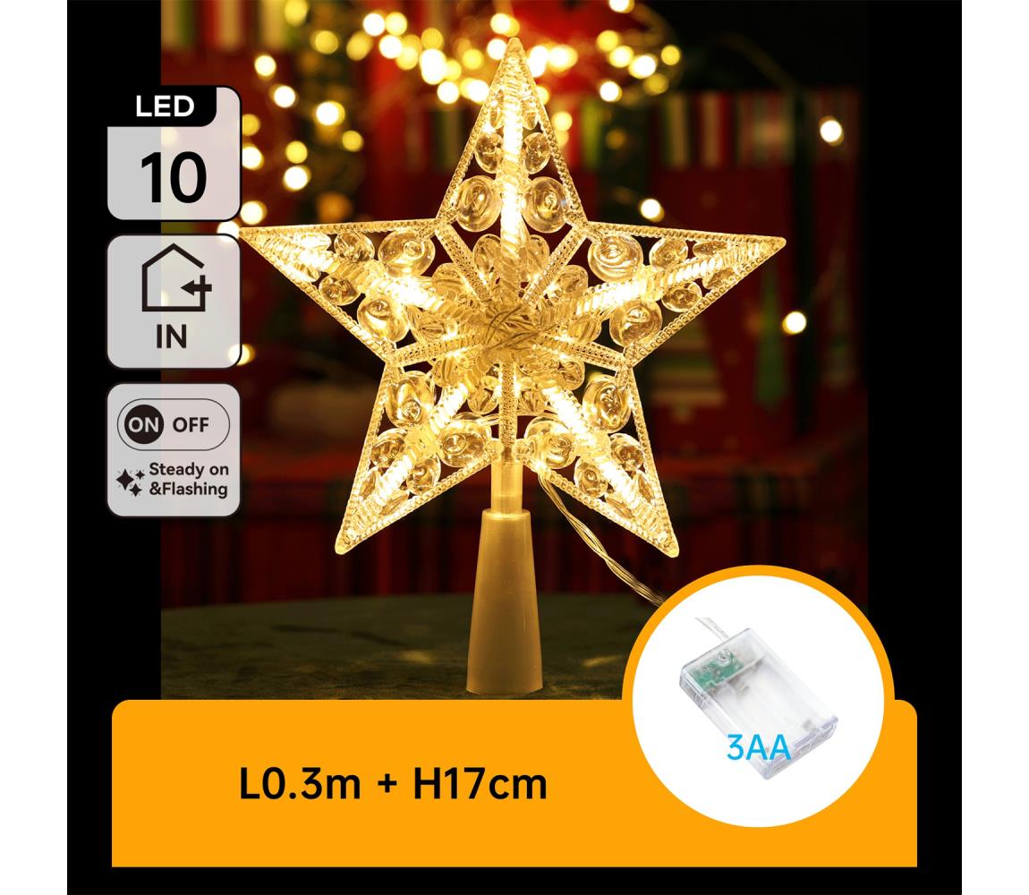 Jõulukaunistus, mis sobib suurepäraselt kodu jõulukaunistamiseks. Sobib kasutamiseks siseruumides. Madala valgusintensiivsuse tõttu kasutatakse seda dekoratiivvalgustina. LED-dioodide arv: 10. Toitejuhtme pikkus: 0,3 m. Valguse värvus: soe valge. Töötab 3x AA patareidega (patareid ei kuulu komplekti).