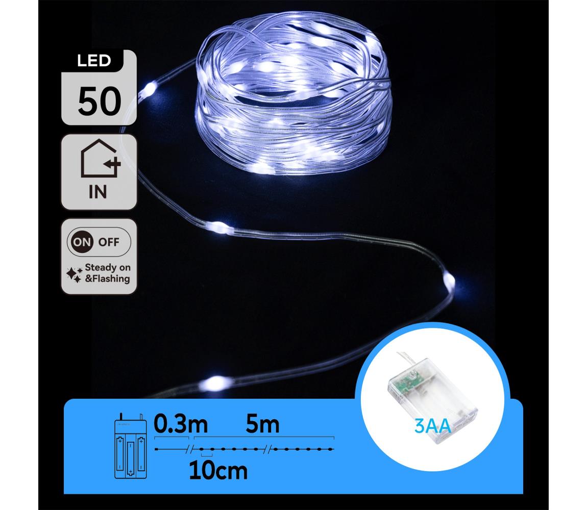 Jõuluaegne ketti, mis sobib suurepäraselt jõulueheteks. Sobib sise kasutamiseks. Kuna valguse intensiivsus on madal, kasutatakse seda dekoratiivse valgustina. LED dioodide arv: 50. Valgustatud kaabli pikkus: 5 m. Toitekaabli pikkus: 0,3 m. Valguse värv: külm valge. Toide: 3xAA patareid.