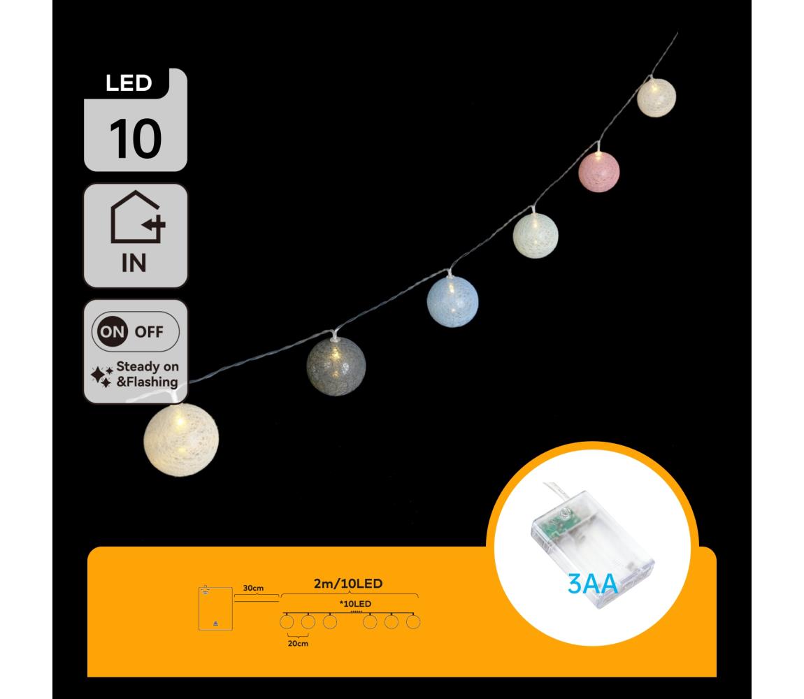 Jõuluaegne ketti, mis sobib suurepäraselt jõulueheteks. Sobib sise kasutamiseks. Kuna valguse intensiivsus on madal, kasutatakse seda dekoratiivse valgustina. LED dioodide arv: 100. Valgustatud kaabli pikkus: 10 m. Toitekaabli pikkus: 0,3 m. Valguse värv: mitmevärviline. Toide: 3xAA patareid.