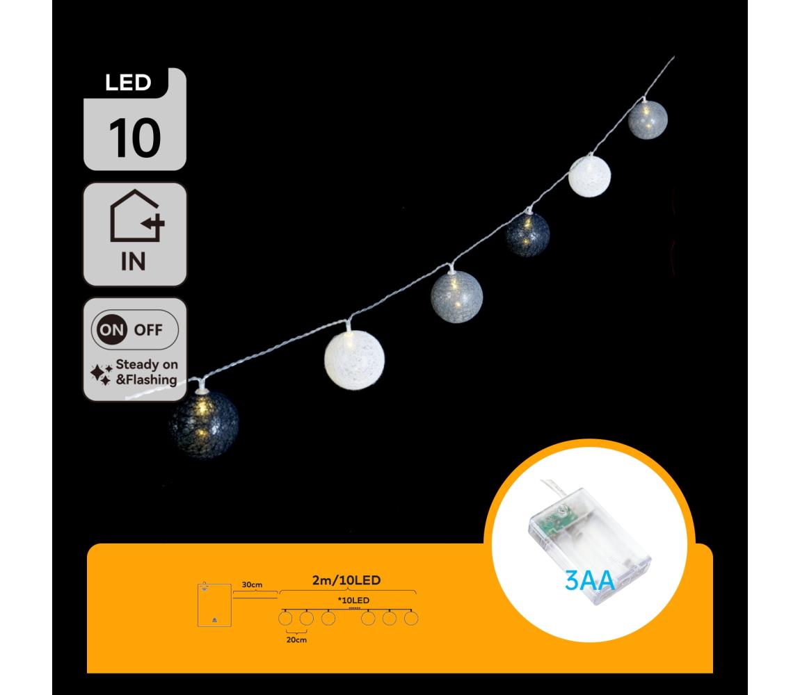 Jõuluaegne ketti, mis sobib suurepäraselt jõulueheteks. Sobib sise kasutamiseks. Kuna valguse intensiivsus on madal, kasutatakse seda dekoratiivse valgustina. LED dioodide arv: 20. Valgustatud kaabli pikkus: 2 m. Toitekaabli pikkus: 0,3 m. Valguse värv: külm valge. Toide: 3xAA patareid (ei kuulu komplekti).