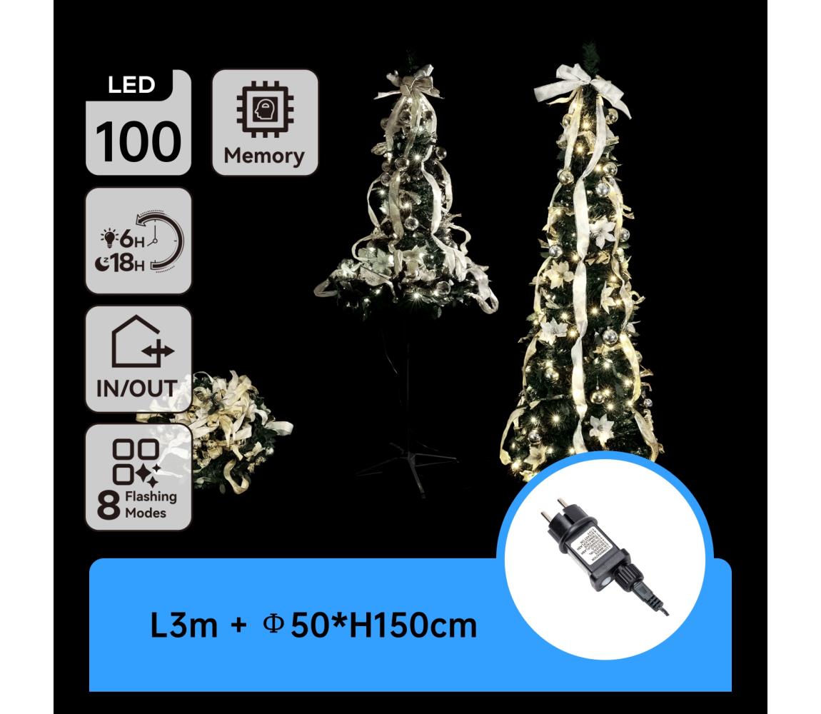 Kokkupandav jõulukuusk, mis sobib suurepäraselt aedade kaunistamiseks. Madala valgusintensiivsuse tõttu kasutatakse seda peamiselt dekoratiivse valgustina. Toidetakse toitekaabli kaudu (toiteadapter kaasas). Pistikutüüp: E - lisateavet leiate siit. 8 valgustusrežiimi. Funktsioonide vahetamist võimaldab pistikul olev lüliti. Mälufunktsioon ja taimer. Valguse värvus: soe valge. Toitekaabli pikkus: 3 m.