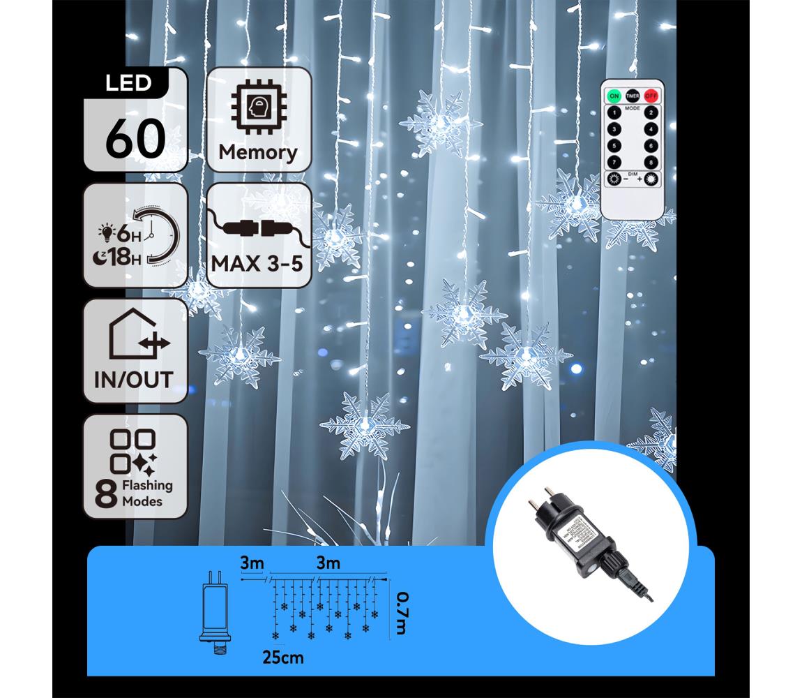 Jõulukaunistuste valguskett, mis sobib suurepäraselt aeda jõulukaunistuseks. Sobib nii sise- kui välikasutuseks. Kaugjuhtimispuldiga juhitav. Madala valgustugevuse tõttu sobib see peamiselt dekoratiivseks valgustuseks. Sisaldab 6h/18h taimerit — pärast sisselülitamist lülitub seade 6 tunni möödudes automaatselt välja ning 18 tunni möödudes uuesti sisse. LED-dioodide arv: 60. Valgustatud kaabli pikkus: 3 m. Toitejuhtme pikkus: 3 m. Valguse värvus: külmvalge. Keti värv: läbipaistev.