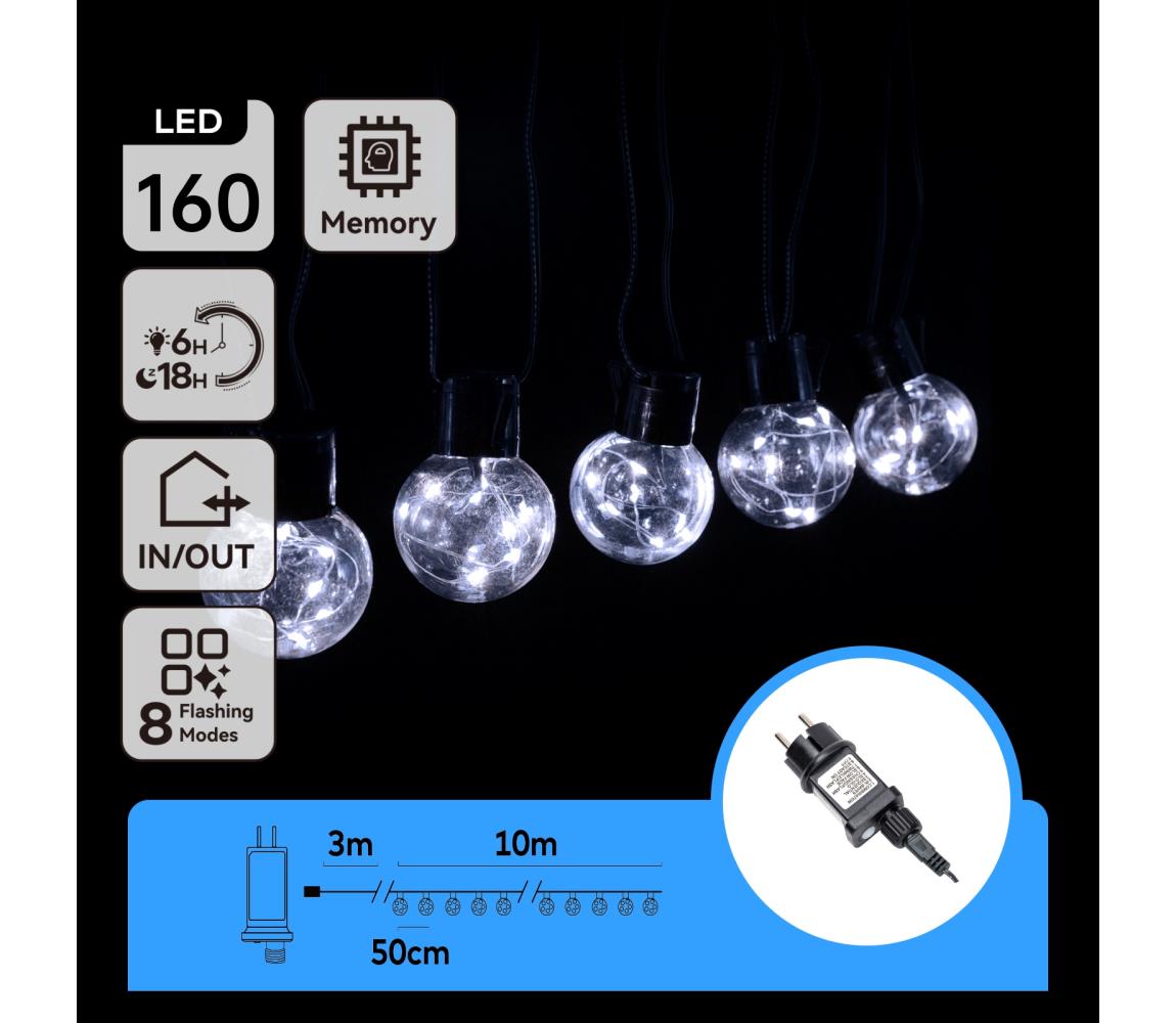 Jõulukett, mis sobib suurepäraselt aia jõulukaunistuseks. Sobib kasutamiseks nii siseruumides kui väljas. Madala valgusintensiivsuse tõttu sobib see peamiselt dekoratiivseks valgustuseks. Sisaldab taimerit 6h/18h - pärast sisselülitamist töötab 6 tundi, seejärel lülitub automaatselt välja ja 18 tunni pärast uuesti sisse. LED-dioodide arv: 160. Valgustatud kaabli pikkus: 10 m. Toitejuhtme pikkus: 3 m. Valguse värvus: külmvalge. Keti värv: läbipaistev.