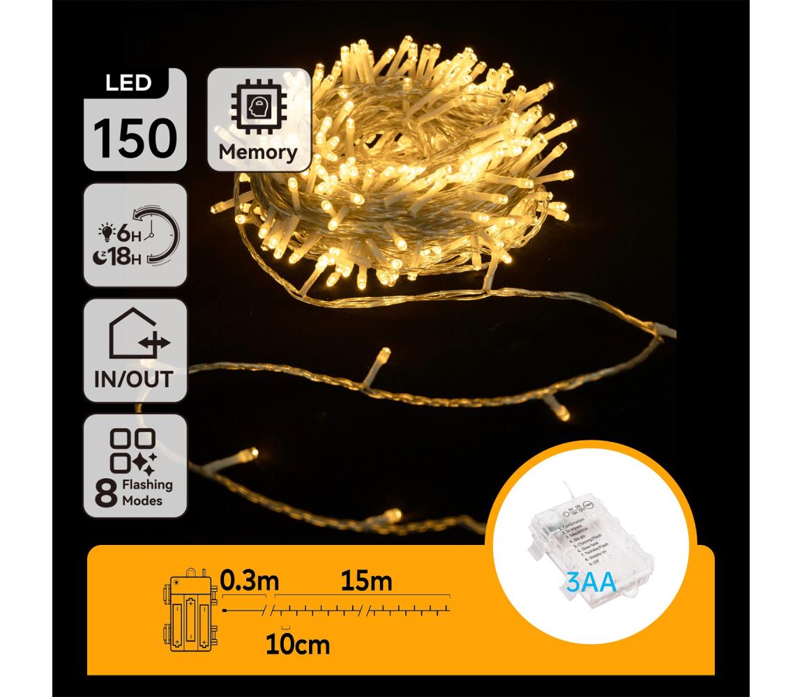 Välistingimused dekoratiivne ahel LED lambidega. Sobib nii välistingimustes kui ka siseruumides kasutamiseks. Kuna valguse intensiivsus on madal, kasutatakse seda dekoratiivse valgustina. 8 valgustusrežiimi (vilkumine, üleminek, hämarus jne). Taimerifunktsioon - 6 tundi sisse/18 tundi välja. LED dioodide arv: 150. Valgustatud kaabli pikkus: 15 m. Toitekaabli pikkus: 0,3 m. Valguse värv: soe valge. Toide: 3xAA patareid (ei kuulu komplekti).