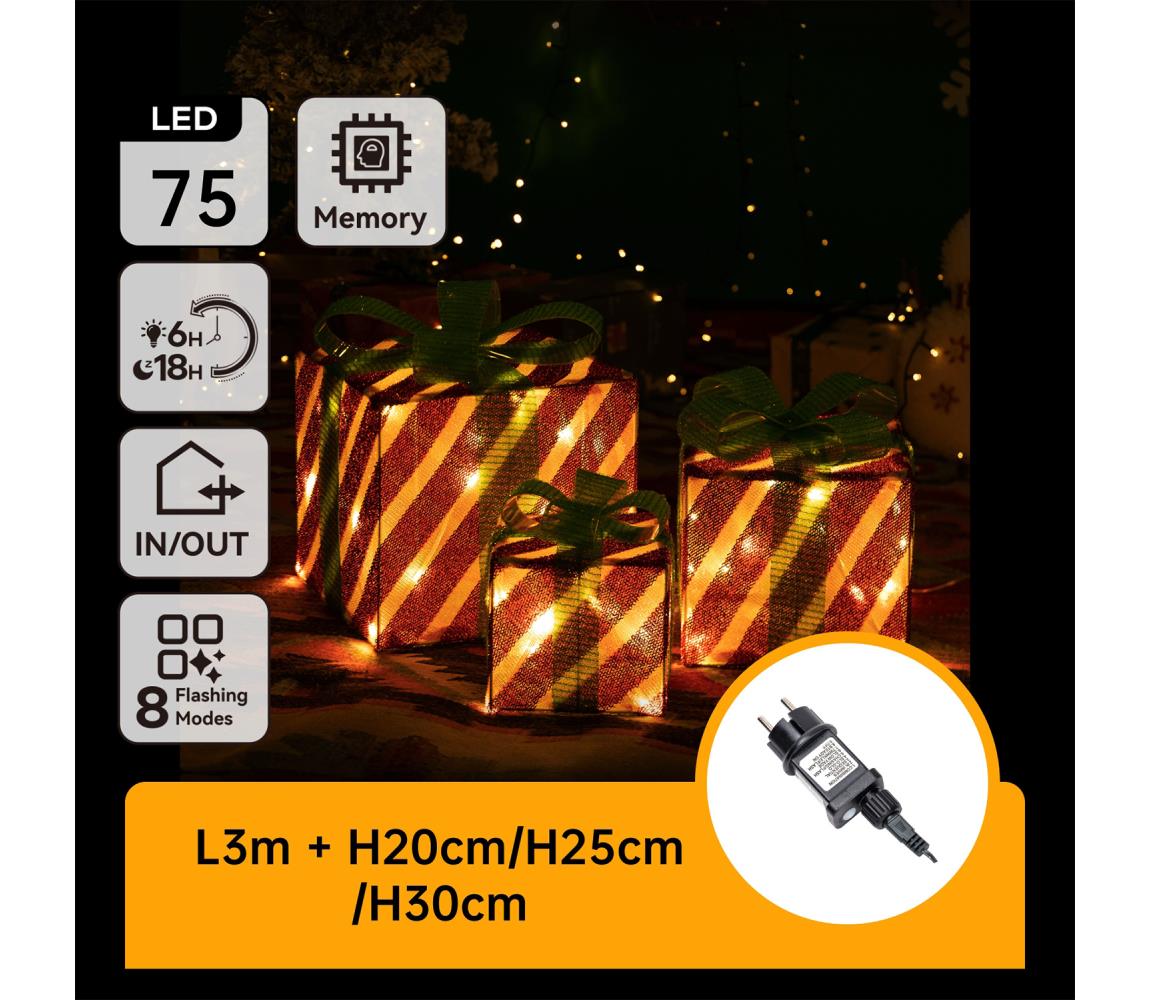 Jõulukaunistus, mis sobib suurepäraselt aia kaunistamiseks. Madala valgusintensiivsuse tõttu kasutatakse seda dekoratiivse valgustina. Toide toimub toitekaabli kaudu (trafot sisaldab komplekt). Pistikutüüp: E - lisateavet leiate siit. 8 valgustusfunktsiooni. Funktsioonide vahetamiseks kasutatakse pistikul olevat lülitit. Mälufunktsioon ja taimer. Valguse värv: soe valge. Kaabli pikkus: 150 cm.