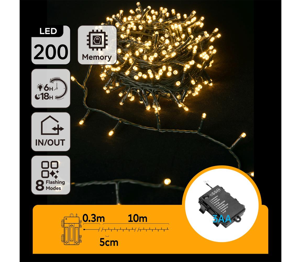 Välistingimused dekoratiivne ahel LED lambidega. Sobib nii välistingimustes kui ka siseruumides kasutamiseks. Kuna valguse intensiivsus on madal, kasutatakse seda dekoratiivse valgustina. 8 valgusrežiimi (vilkumine, üleminek, hämarus jne). Taimerifunktsioon - 6 tundi sisse/18 tundi välja. LED dioodide arv: 200. Valgustatud kaabli pikkus: 10 m. Toitekaabli pikkus: 0,3 m. Valguse värv: soe valge. Toide: 3xAA patareid (ei kuulu komplekti).