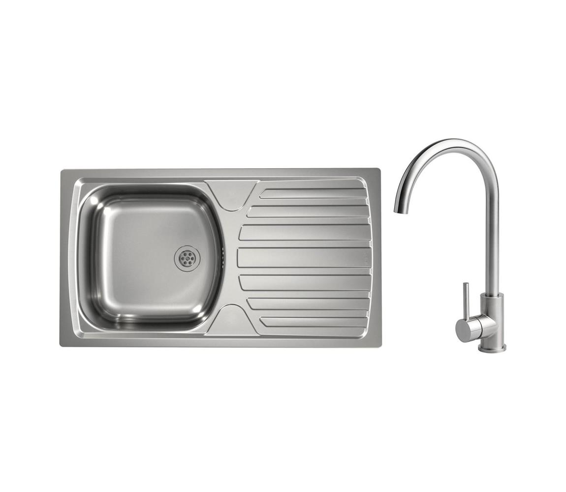 Roostevabast terasest köögivalamu klassikalise disainiga, koos praktilise valamukraaniga. Köögivalamu BASIC: Valmistatud kvaliteetsest roostevabast terasest, mis on korrosioonikindel ja lihtsasti puhastatav. Valamul on üks suur valamukauss, mis annab piisavalt ruumi ka suurte pottide pesemiseks. Käsitsi juhitav äravool — äravool sulgub ja avaneb, kui sõela vajutada. Pööratav — valamukauss võib olla paigaldatud nii vasakule kui paremale. Ülevool on paigutatud valamukaussi. Koos nõrutusalusega. Valamu on tehasest aukudeta – kraani jaoks tuleb teha auk. Mõõtmed: 14 x 78 x 43,5 cm. Valamukraan VIOLA: Ühehoobiga köögikraan kõrge rõhuga ja pöörleva otsikuga. Moodne roostevabast terasest viimistlus. Tagab lihtsa ja sujuva vee temperatuuri ning vooluhulga reguleerimise. Paigaldus standardse 35 mm avasse. Mõõtmed: 36,7 x 24,1 cm. Komplekti sisu: roostevabast terasest valamu, kinnitusdetailid ja tihendid, äravool 1 1/2", sifoon nõudepesumasina haruga, kork, valamukraan, ühendusvoolikud, paigalduskomplekt.