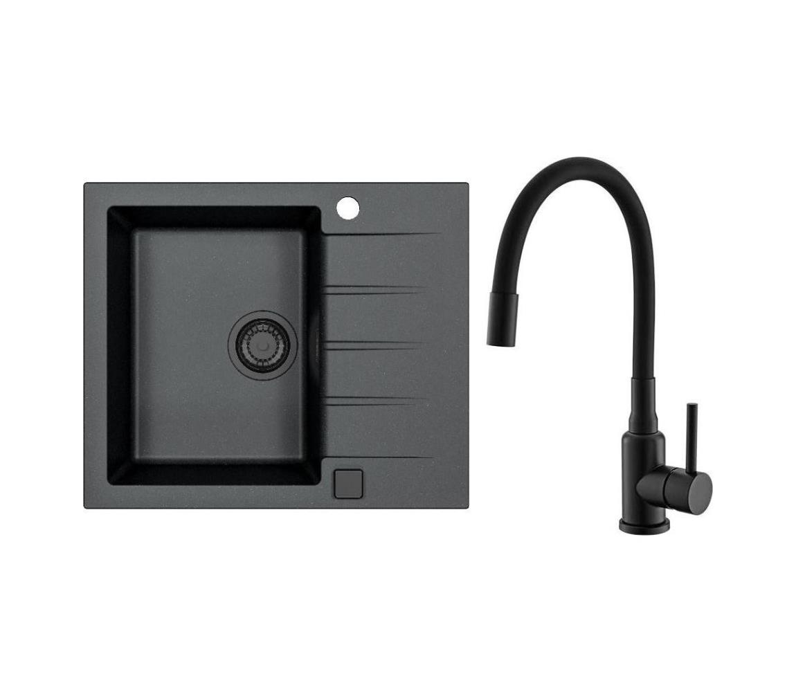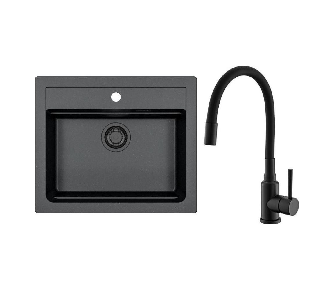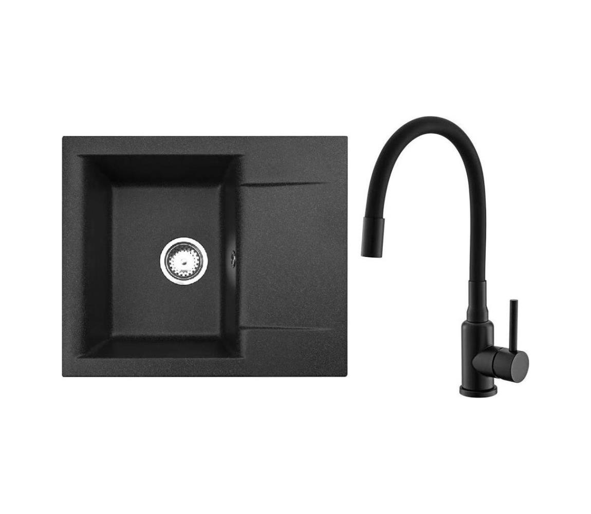 Köögivalamu koos kaasaegse segistiga. Köögivalamu CADIT: Valmistatud kvaliteetsest graniidist, mis on vastupidav kriimustustele, plekkidele ja kõrgetele temperatuuridele. Ühe kraanikausiga, mis pakub piisavalt ruumi nõude pesemiseks. Käsitsi juhitav äravool - äravool sulgub ja avaneb korvstopperi vajutamisel. Ülevool asub valamu kausis. Segistiavaga. Mõeldud paigaldamiseks tööpinna peale. Mõõtmed: 19,8 x 59 x 50 cm. Valamusegisti MINTAS: Ühehoobiga köögisegisti, sobib kõrgetele veerõhkudele, pöörleva otsikuga. Võimaldab lihtsat ja sujuvat vee temperatuuri ning vooluhulga reguleerimist. Praktiline painduv otsik. Paigaldus standardsele 35 mm avale. Mõõtmed: 34 x 21 x 4,9 cm. Pakendi sisu: graniitvalamu, korvventiil 3 1/2, sifoon pesumasina haruga, valamusegisti, ühendusvoolikud, paigalduskomplekt.