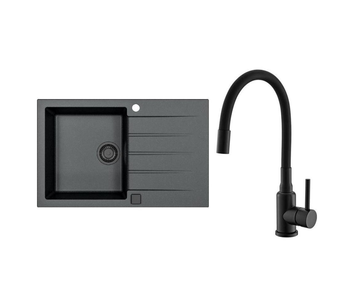 Köögivalamu kaasaegse valamukraaniga. Köögivalamu ROCK: Valamu on valmistatud kvaliteetsest graniitkomposiidist, mis on vastupidav kriimustustele, plekkidele ja kõrgetele temperatuuridele. See on ühe kausiga, mis pakub piisavalt ruumi nõude pesemiseks. Ekstsentriline äravoolu juhtimine - äravool sulgub ja avaneb, keerates valamul olevat nuppu. Ülevooluava asub valamu kausis. Varustatud kraaniavaga ja ekstsentrilise äravoolu juhtimisega. Sobib paigaldamiseks tööpinna peale. Mõõtmed: 18 x 78 x 48 cm. Valamukraan MINTAS: Ühehoobiline köögikraan, sobib kõrgsurve süsteemidele ja on pööratava kaelaga. Tagab lihtsa ja sujuva vee temperatuuri ning vooluhulga reguleerimise. Praktiline painduv otsik. Sobib paigaldamiseks standardavasse 35 mm. Mõõtmed: 34 x 21 x 4,9 cm. Pakendi sisu: graniitvalamu, kinnitusklambrid, restventiil 3 1/2, sifoon pesumasina haruga, ekstsentriline äravoolu juhtimine, valamukraan, ühendusvoolikud, paigalduskomplekt.
