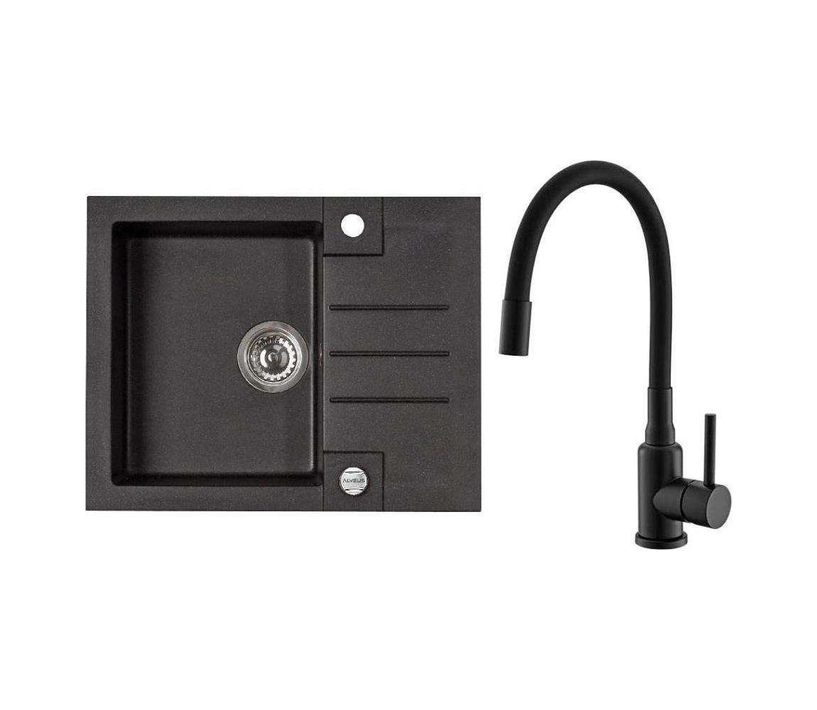 Köögivalamu kaasaegse segistiga. Köögivalamu ATROX: Valmistatud kvaliteetsest graniitkomposiidist, mis on vastupidav kriimustustele, plekkidele ja kõrgetele temperatuuridele. Ühekausiline disain, mis pakub piisavalt ruumi nõude pesemiseks. Käsitsi juhitav äravool - äravool sulgub ja avaneb sõela vajutades. Ülevool asub valamu kausis. Segistiava. Mõõtmed: 19,5 x 59 x 50 cm. Köögisegisti MINTAS: Ühehoovaga köögisegisti kõrge rõhuga ja pööratava kaelaga. Võimaldab mugavat ja sujuvat vee temperatuuri ning vooluhulga reguleerimist. Praktiline painduv kael. Paigaldamiseks standardavasse 35 mm avasse. Mõõtmed: 34 x 21 x 4,9 cm. Pakendi sisu: graniitkomposiitvalamu, kinnitusklambrid, sõelventiil 3 1/2, sifoon nõudepesumasina haruga, köögisegisti, ühendusvoolikud, paigalduskomplekt.
