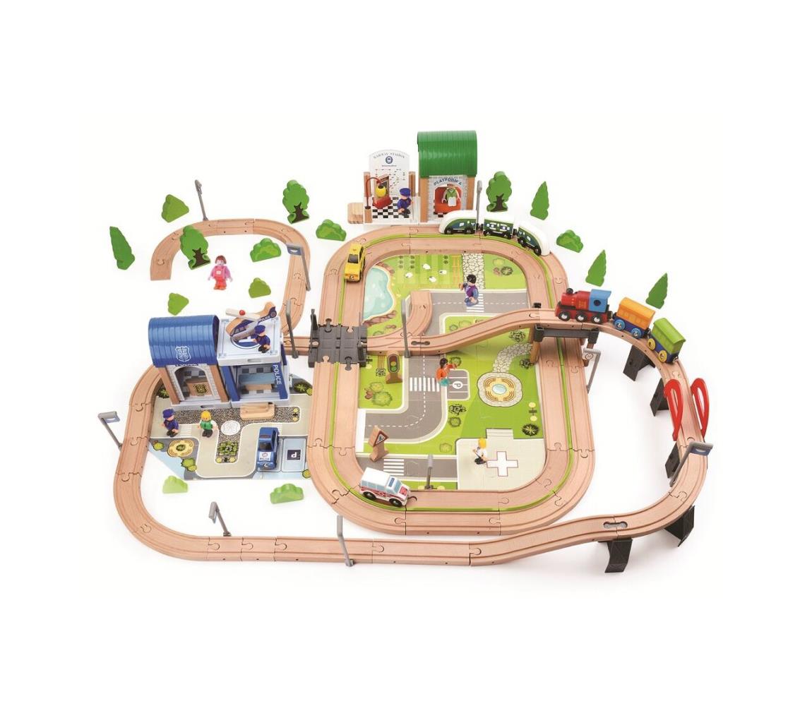 Ühendades puidust rongiradade komplektid Město ja Vesnice tekib terviklik liiklusmaailm. Komplekt arendab peenmotorikat, koordinatsiooni, loovust ja ruumilist kujutlusvõimet. 200 osa (110 osa komplektist Vesnice + 90 osa komplektist Město). Komplekt sisaldab: rööpaid, ronge, vaguneid, sildu, jaama, autosid, figuure, liiklusmärke, puid, tõkkepuu ja trükitud teedealuseid. Sobib lastele alates 3. eluaastast.