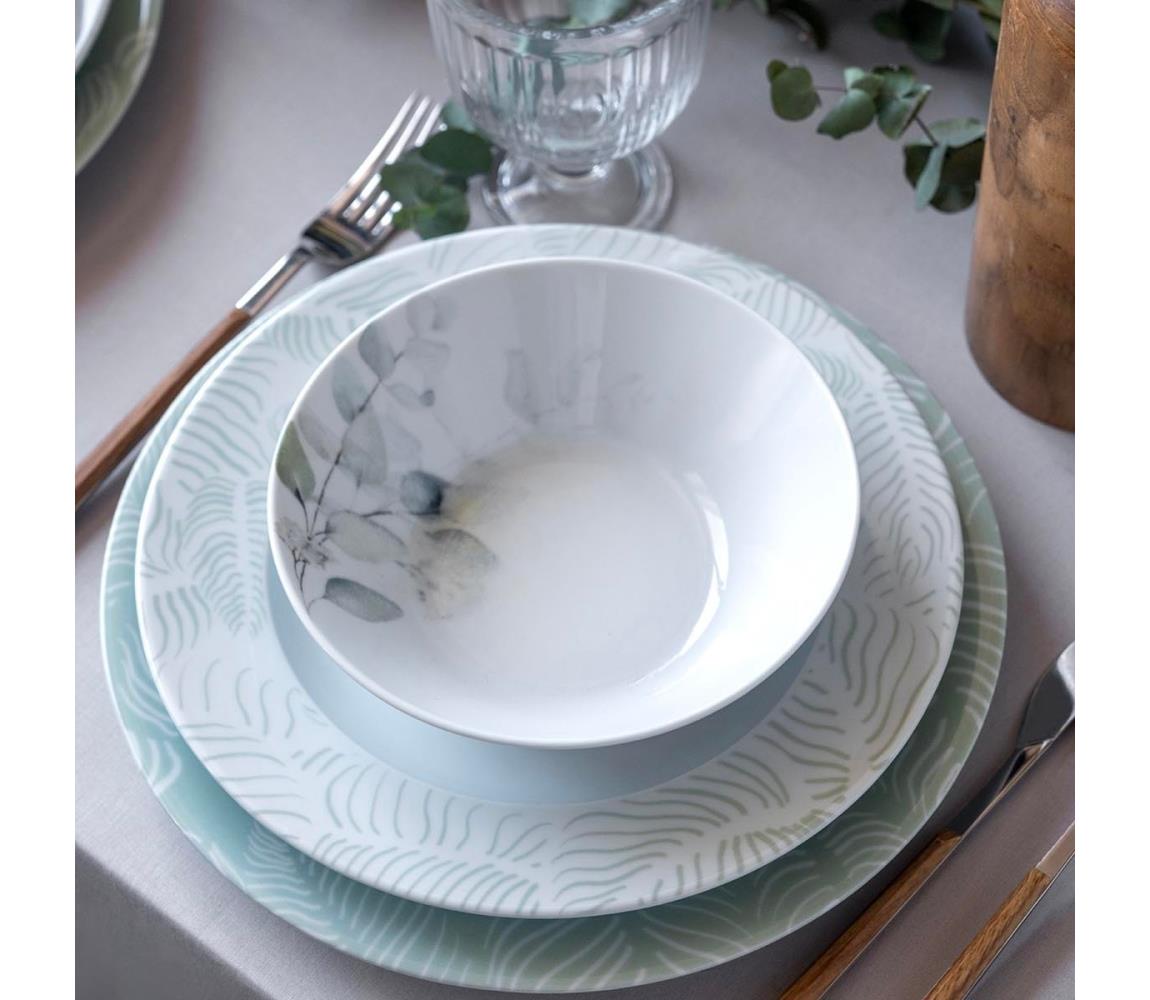 Elegantne sööginõude komplekt, mis sobib nii igapäevaseks lauakatmiseks kui ka pidulikeks sündmusteks. Valmistatud 100% portselanist (koostis: kaoliin, kvarts, feldspaat), mis tagab suure vastupidavuse ja pika kasutusea. Sobib kasutamiseks nii nõudepesumasinas kui ka mikrolaineahjus. Komplekt sisaldab: Serveerimistaldrik: 27 cm (6 tk). Taldrik: 23 cm (6 tk). Magustoidutaldrik: 21 cm (6 tk). Kauss: 15 cm (6 tk).