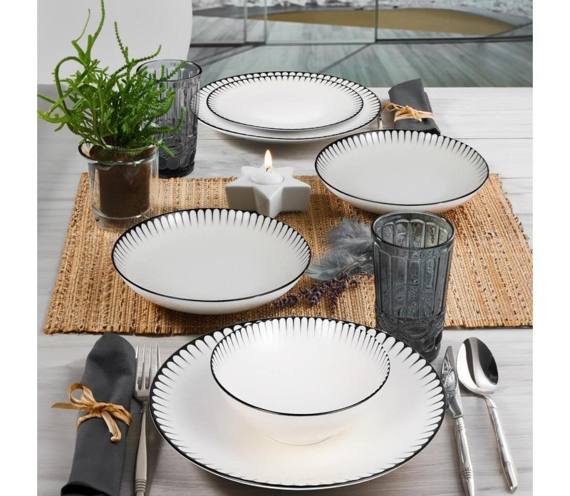 Elegantne sööginõude komplekt, mis sobib nii igapäevaseks lauasöögiks kui ka pidulikeks sündmusteks. Valmistatud 100% portselanist (koostis: kaoliin, kvarts, füldspaat), mis tagab suure vastupidavuse ja pika kasutusea. Sobib kasutamiseks nõudepesumasinas ja mikrolaineahjus. Komplekt sisaldab: Serveerimistaldrik: 25 cm (6 tk). Taldrik: 18,5 cm (6 tk). Kauss: 14 cm (6 tk). Magustoidutaldrik: 19 cm (6 tk). Piklik taldrik: 19 cm (1 tk). Piklik taldrik: 24 cm (2 tk).