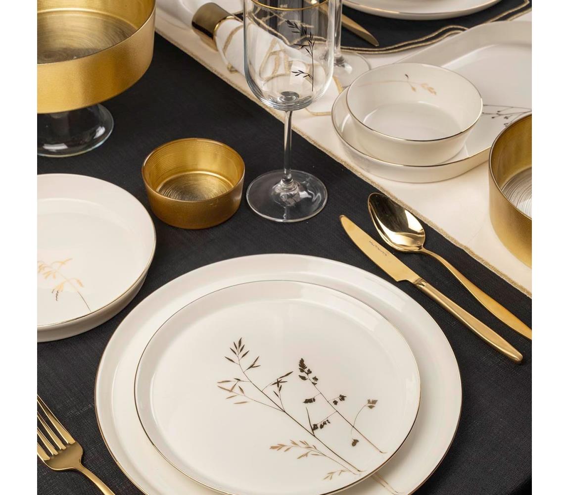 Elegantne sööginõude komplekt, mis sobib nii igapäevaseks kasutamiseks kui ka pidulikeks sündmusteks. Valmistatud luuporselanist (koostis: kaoliin, kvarts, feldspaat, luutuha 30–45 %), mis paistab silma erakordse kerguse, tugevuse ja õrna läikega. Ei sobi nõudepesumasinasse ega mikrolaineahju. Pakk sisaldab: Serveerimisvaagen: 27 cm (6 tk). Sügav taldrik: 23 cm (6 tk). Kauss: 16 cm (6 tk). Magustoidutaldrik: 21 cm (6 tk). Vaagen: 28 cm (1 tk). Vaagen: 24 cm (1 tk).
