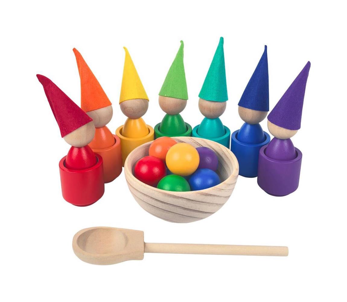Lõbus puidust õppemäng, inspireeritud Montessori-mänguasjadest. Mäng aitab arendada värvitaju, puutetundlikkust, motoorseid ja visuaalseid oskusi. Väga populaarne interaktiivne mänguasi, mis toetab meelte arengut. Õpetab lapsi esemeid käsitsema ning mänguliselt avastama kujude ja värvide maailma. Harjutab peenmotoorikat ja käe-silma koordinatsiooni. Kausi läbimõõt: ø 11,8 cm.Vikerkaarenuku läbimõõt: ø 2,7 cm.Tassi läbimõõt: ø 2,8-3,7 cm.Sobib lastele alates 3. eluaastast.