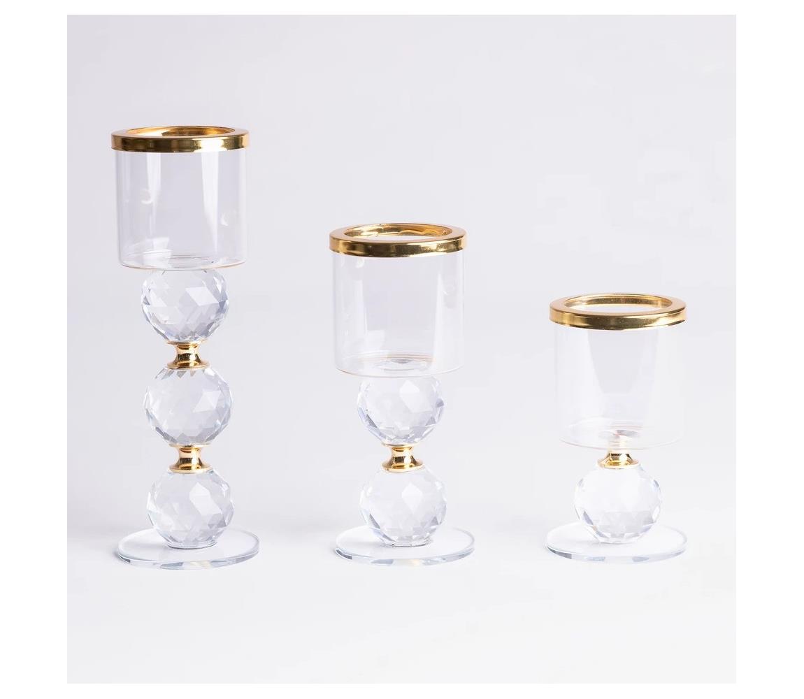 Elegantne kolmest küünlahoidjast komplekt kuldse viimistlusega. Sobib ideaalselt pühadeks, pulmadeks ja teisteks pidustusteks. Valmistatud vastupidavast metallist ja klaasist. Komplektis on 3 küünlahoidjat.