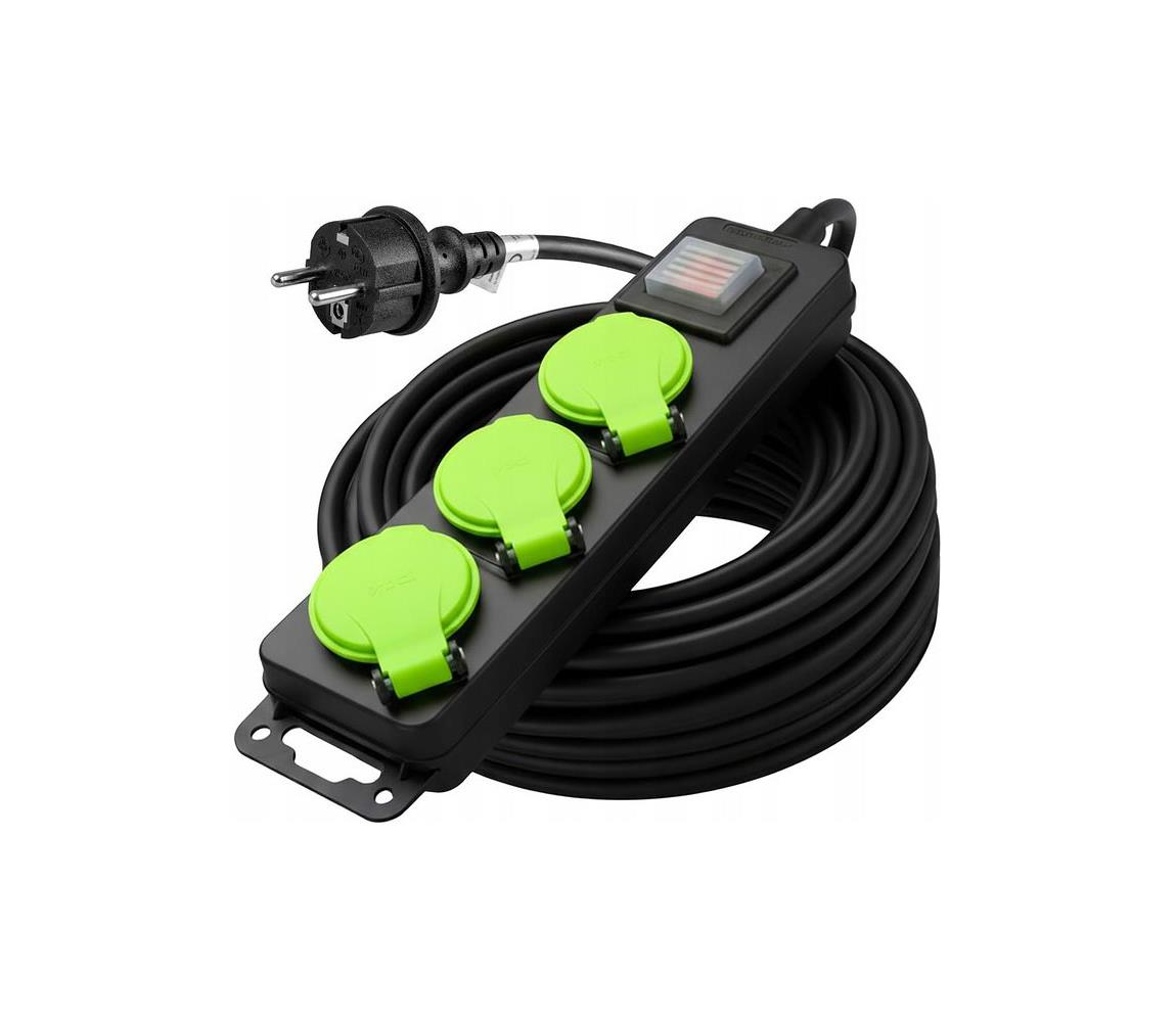 Pikendusjuhe, sobib nii aeda kui ka ehitustöödeks. Kaabli pikkus: 20 m. Pistikupesade arv: 3. Automaatselt sulguvad pistikupesad – kaitsevad niiskuse, vihma ja mustuse eest. Kaitseklass: IP44. Maksimaalne võimsus: 3680 W / 16 A. Paigaldusavad riba mõlemal küljel – võimaldavad lihtsat riputamist või kinnitamist. Juhtme ristlõige: 3 × 1,5 mm². LED-taustvalgustusega lüliti. Kummist isolatsioon. Pikendusjuhe vastab kõigile ohutusnõuetele. Lastekaitse – kaitseb juhusliku käe sisestamise eest. Korpus on mittesüttivast materjalist. Korpuse mõõtmed: 28,5 × 7,5 × 4 cm.