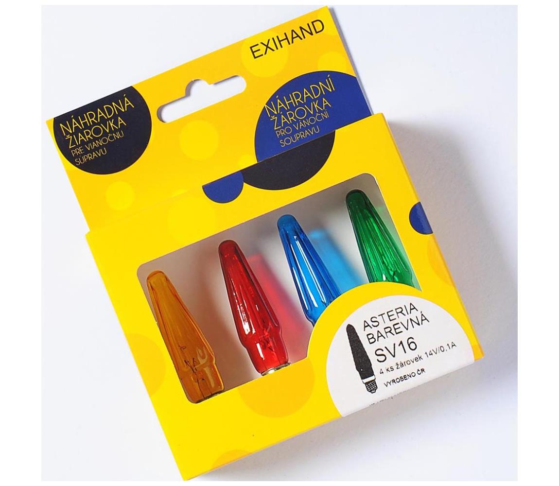Varuosasid jõulutuledesele ASTERIA.Komplekt sisaldab nelja lambipirni (värvide segu - sinine, roheline, punane, kollane).Minimaalne kasutusiga 500 tundi.Traditsioonilised käsitsi valmistatud lambipirnid Tšehhi klaasimeistritelt.