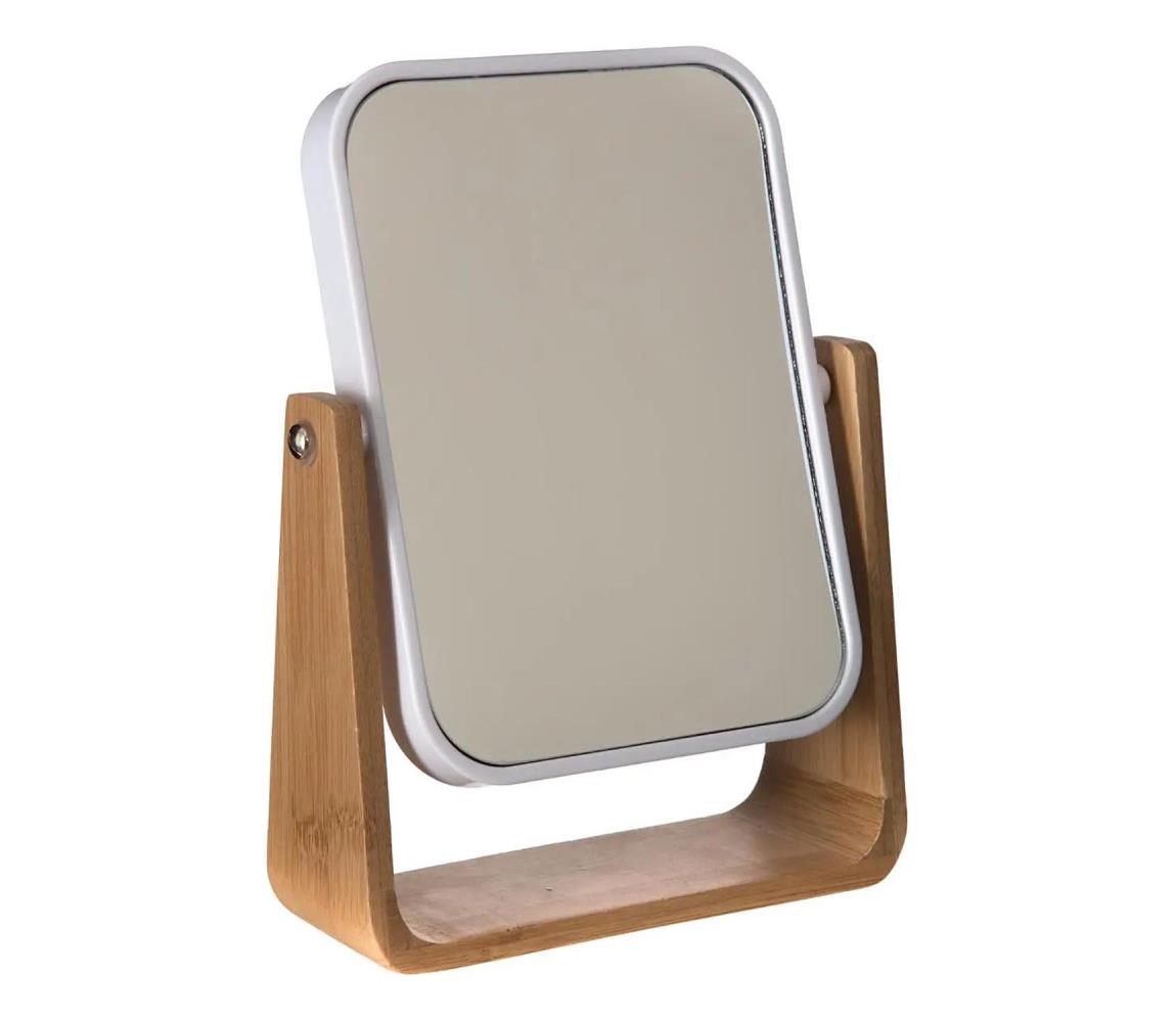 Kosmeetiline lauapeegel. Ristkülikukujuline raam on valmistatud massiivsest bambuspuust ja tagab suurepärase stabiilsuse. Peegli mõõtmed: 17,5 cm x 13,5 cm,
