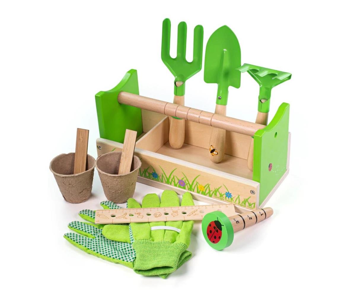 Vahend alati käepärast kõigile väikestele aednikele.Sel komplektiga saavad lapsed aias palju lõbu nautida.Samal ajal saavad nad avastada looduse ringkäiku ja aidata vanematel töös.Komplekt on valmistatud kvaliteetsest puidust ja metallist.See on kaunistatud erksate roheliste toonidega, millel on lepatriinu ja lillede kujundus.Komplekt sisaldab kokku 11 mänguosa, sealhulgas aiakindaid, joonlauda, istutuskangi ja palju muud.Tööriistad on spetsiaalselt loodud väikestele kätele.Käepidemed on valmistatud siledast puidust, mis on tehtud kvaliteetsetest ja vastutustundlikult hangitud materjalidest ning on mugavalt haaratavad.Vastab kehtivatele Euroopa ohutusstandarditele.Sobib lastele alates 3. eluaastast.