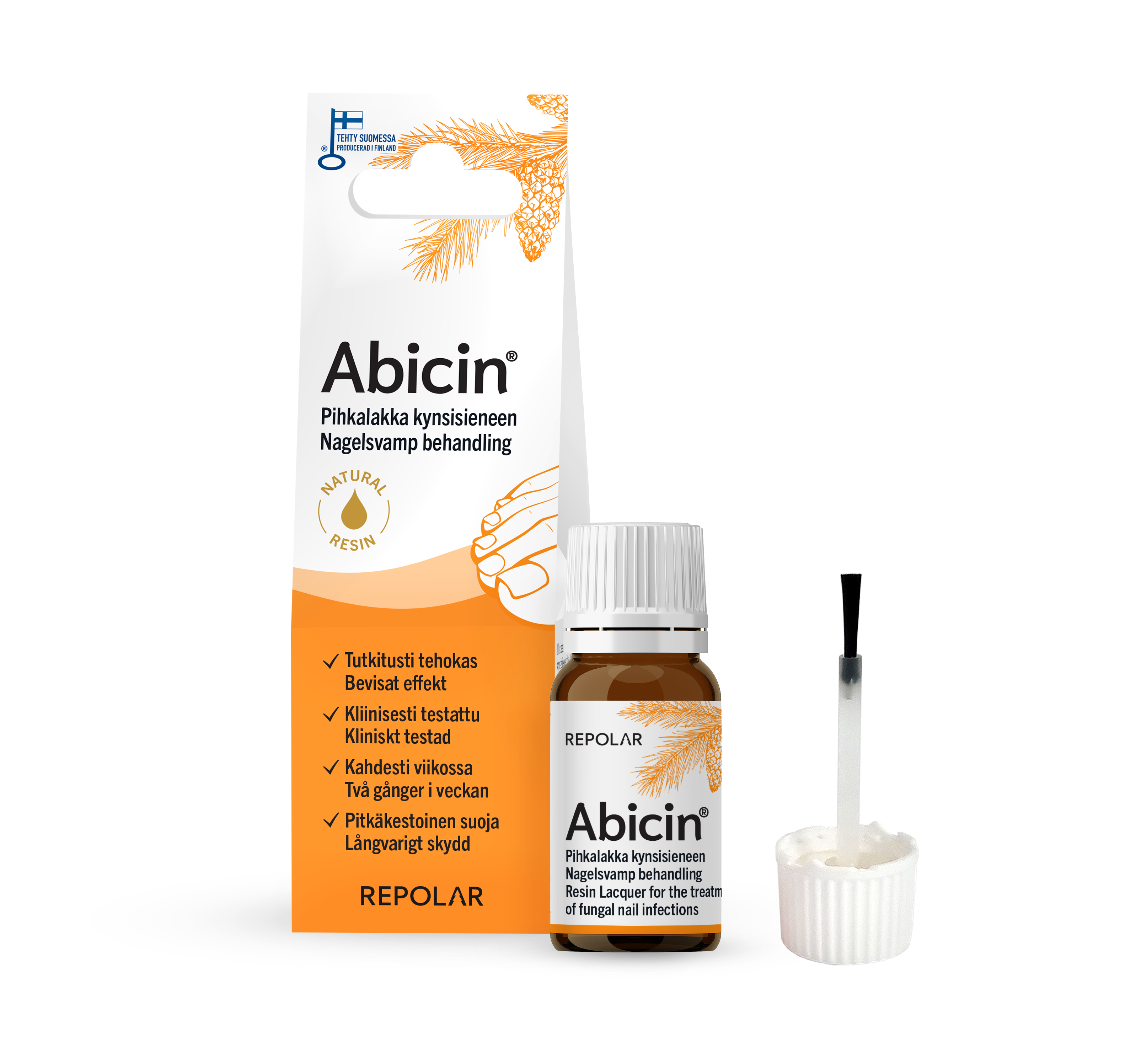 Abicin® 30% vaigulakki kasutatakse küüneseene ja küünevalli põletiku puhul. Vaigulakki kasutatakse välispidiselt paikseks raviks. Kuusevaigu (Picea abies) komponentidel on teaduslikult tõestatud tugev antimikroobne ja seenevastane toime. Abicin® 30% vaigulakk koosneb kuusevaigust ja meditsiiniliseks kasutamiseks mõeldud küünelakist. Toorvaik puhastatakse vastavalt Repolar Pharmaceuticals Oy poolt patenteeritud meetodile. Kuusevaik kogutakse puid kahjustamata Põhja-Soomest. Abicin® 30% vaigulaki koostist, puhtust ning bioloogilisi ja antimikroobseid toimeid kontrollitakse iga tootepartii puhul. Hoiatused: Ainult välispidiseks kasutamiseks! Hoida lastele kättesaamatus kohas! Pärast kasutamist sulgege tihedalt ja hoidke vertikaalasendis! Hoiatused: Ainult välispidiseks kasutamiseks! Hoida lastele kättesaamatus kohas! Pärast kasutamist sulgege tihedalt ja hoidke vertikaalasendis!