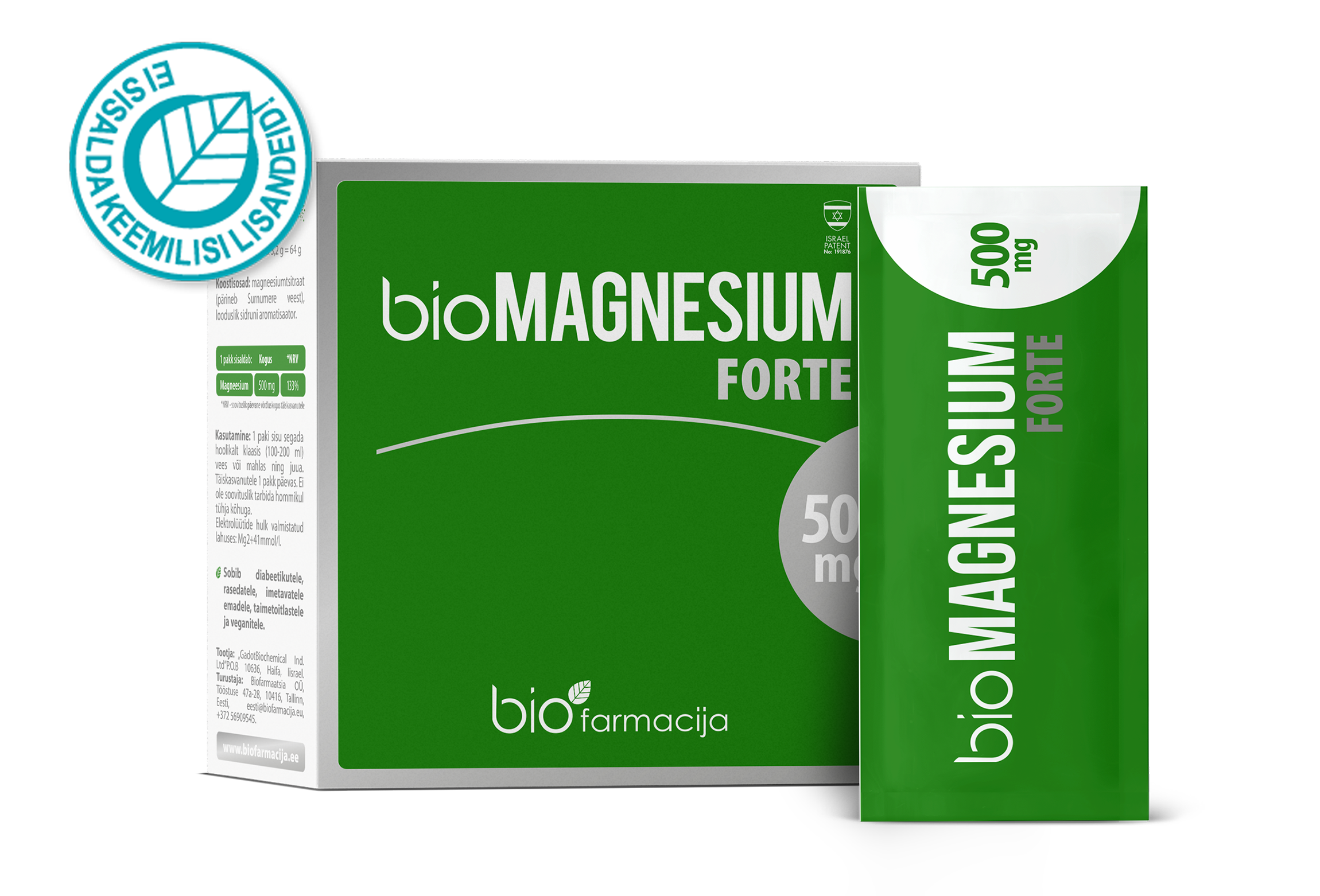 bioMagnesium Forte täiendab teie keha puhta, looduslikku päritolu magneesiumtsitraadiga. Sobib kogu perele! Sobib ka taimetoitlastele, veganitele ja diabeetikutele. Magneesium on vajalik närvisüsteemi ja lihaste normaalseks talitluseks. Magneesium aitab vähendada väsimust ja kurnatust. Magneesium aitab hoida luid ja hambaid normaalsetena. Magneesium on vajalik valkude, rasvade ja süsivesikute normaalseks ainevahetuseks. Magneesium aitab kaasa elektrolüütide tasakaalule ja energiavahetusele. Magneesium osaleb rakujagunemise protsessis. KEEMILISTE LISAAINETEVABA TOODE! Toidulisand ei sisalda kunstlikke magus-, värv-, maitse-ja säilitusaineid, stabilisaatoreid, paksendajaid ega emulgaatoreid. Eesliide “BIO” toote ja ettevõtte nimes viitab bioloogilisele omastamisele ja biokeemilisele olemusele ega ole seotud ökoloogilise tootmisega Hoiatused: Oluline on toituda mitmekülgselt ja tasakaalustatult ning harrastada tervislikku elustiili! Mitte ületada päevaseks tarbimiseks soovitatavat kogust! Toidulisandit mitte kasutada mitmekesise toitumise asendajana! Hoida toodet lastele kättesaamatus kohas!