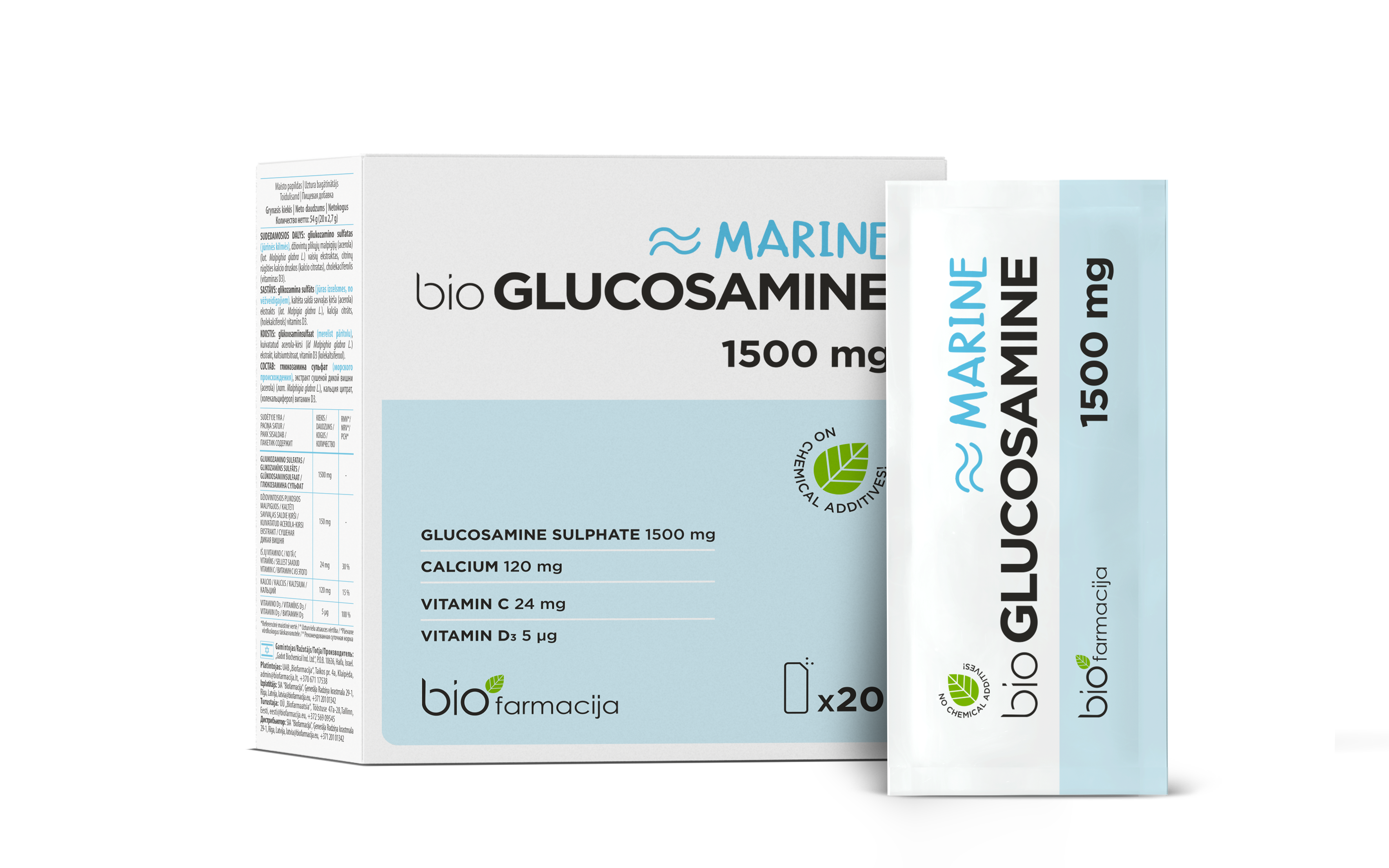 Loodusliku, merelise päritoluga suure glükoosamiini sisaldusega preparaat liigeste ja luude tervise toetuseks. Glükoosamiin on orgaaniline süsivesikute ja valguühend (aminopolüsahhariid), mis sisaldub erinevates inimese kudedes, peamiselt kõhres. Kaltsium ja vitamiin D aitavad säilitada luude ja hammaste normaalset tervist ning lihaste tööd. Vitamiin D aitab kaasa normaalsele kaltsiumi ja fosfori imendumisele. Vitamiin C ja D aitavad kaasa immuunsüsteemi normaalsele talitlusele. Vitamiin C aitab kaasa närvisüsteemi normaalsele talitlusele ja normaalsetele psühholoogilistele funktsioonidele. Vitamiin C ja kaltsium aitavad kaasa normaalsele energiavahetusele. Vitamiin C aitab vähendada väsimust ja kurnatust. Toode ei sobi taimetoitlastele ja veganitele. KEEMILISTE LISAAINETEVABA TOODE! Toidulisand ei sisalda kunstlikke magus-, värv-, maitse-ja säilitusaineid, stabilisaatoreid, paksendajaid ega emulgaatoreid. Eesliide “BIO” toote ja ettevõtte nimes viitab bioloogilisele omastamisele ja biokeemilisele olemusele ega ole seotud ökoloogilise tootmisega. Hoiatused: Oluline on toituda mitmekülgselt ja tasakaalustatult ning harrastada tervislikku elustiili!Mitte ületada päevaseks tarbimiseks soovitatavat kogust!Toidulisandit mitte kasutada mitmekesise toitumise asendajana!Hoida toodet lastele kättesaamatus kohas!
