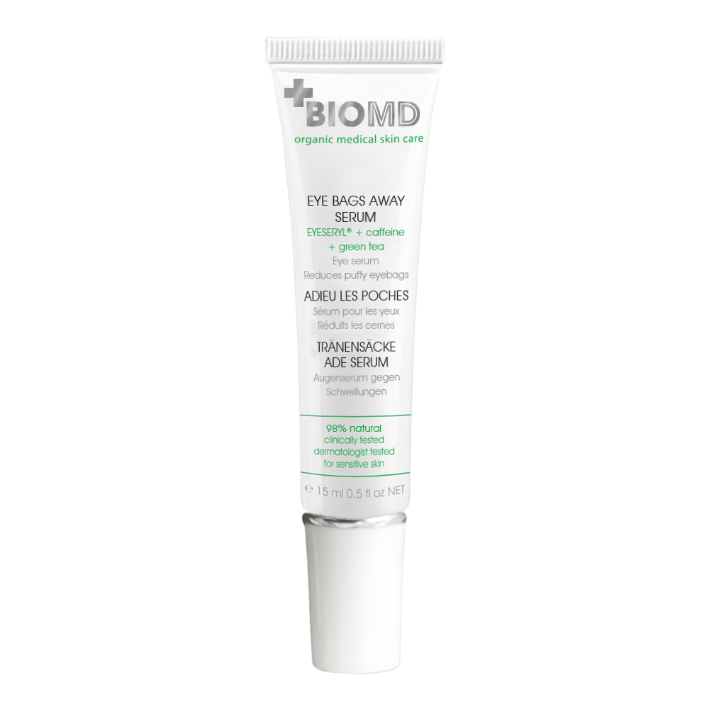 BioMD Eye Bags Away Eye Serum silmaaluste tursete vastu aitab vähendada silma all olevaid turseid ning pärssida veresoonte läbilaskvust. Seerumis olev kofeiin aitab vähendada silmaaluste tursete teket, ahendades veresooni ja kaitseb päikesekahjustuste eest. Hoiab ära pigmentatsiooni, mis võib põhjustada tumedaid ringe. Roheline tee aitab vähendada turset, pinguldab silmaümbruse nahka ja vähendab silmade all olevate veresoonte laienemist tänu rohelises tees sisalduvatele looduslikele tanniinidele, millel on veresooni ahendavad omadused. Lisaks aitab seerub vähendada miimikakortse ja silub ning niisutab silmaümbrust.