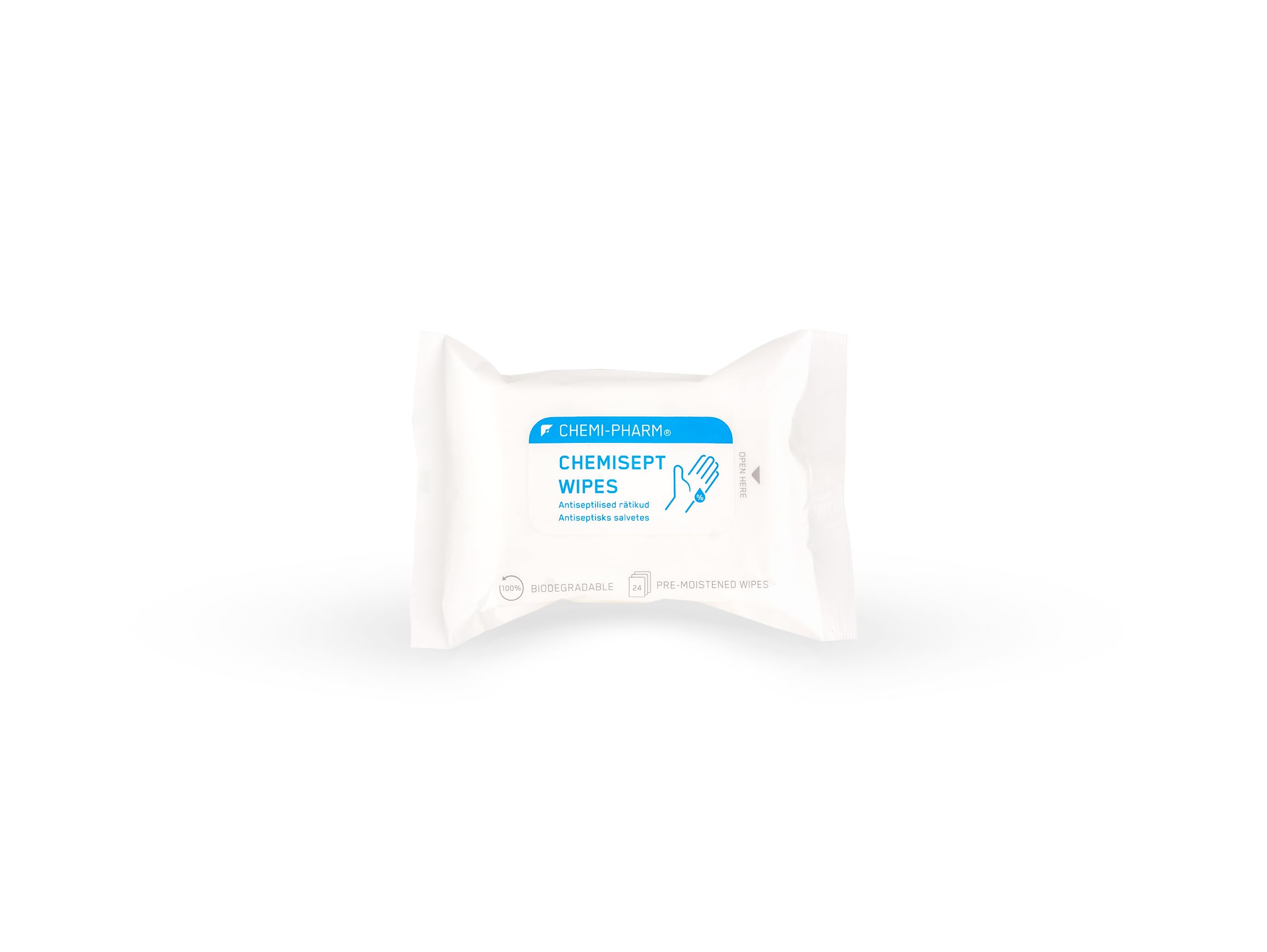 Chemisept Wipes on alkoholiga immutatud rätikud käte hügieeniliseks antiseptikaks. Toode on laia fungitsiidse, virutsiidse ja bakteritsiidse toimega. Toode on nahasõbralik ja sisaldab pantenooli, millel on nahka pehmendav, niisutav ja põletikuvastane toime. Sobib ka väikelaste käte puhasta-miseks.