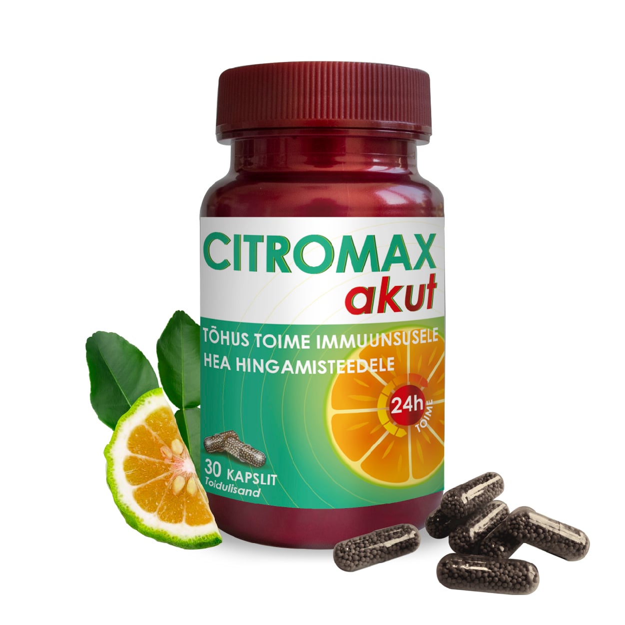 Citromax AKUT on spetsiaalne toode ülemiste hingamisteede hea tervise säilitamiseks. Citromax AKUT kapslid tagavad kiire ja samal ajal kauakestva toime, tänu spetsiaalsele toimeainet järkjärgult vabastava mikrokapslite tehnoloogiale. C-vitamiin ja piparmündi õli toetavad immuunsüsteemi normaalselt efektiivset toimimist. Tsitruse bioflavonoidid ja eukalüptiõli toetavad hingamisteede head tervist, rahustavad kurku ja neelu ning mõjuvad rahustavalt häälepaeltele. Tõmmu pelargoonium toetab hingamisteede head tervist looduslikul viisil. Hoiatused: Oluline on toituda mitmekülgselt ja tasakaalustatult ning harrastada tervislikku elustiili!Mitte ületada päevaseks tarbimiseks soovitatavat kogust!Toidulisandit mitte kasutada mitmekesise toitumise asendajana!Hoida toodet lastele kättesaamatus kohas!