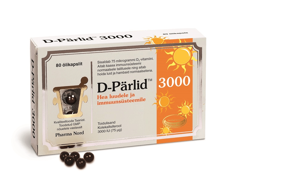 D-PÄRLID 1000 on väikesed õlikapslid, mis sisaldavad 25 µg (1000 IU) D3-vitamiini igas kapslis. Tänu oma väiksusele on neid mugav neelata. D-vitamiin on lahustatud külmpressitud oliiviõlis, sest D-vitamiin on rasvlahustuv. Pärlite suuruse tõttu on neid mugav neelata, kuid neid võib ka närida. D-Pärlite hea imendumine on uuringutega tõestatud. Põhjamaades elavatel inimestel esineb sagedasti D-vitamiini puudus. D-vitamiin on asendamatu rasvlahustuv vitamiin, mis on vajalik luude ja hammaste terviseks, lihaste ja immuunsüsteemi normaalseks talitluseks ning lisaks toetab D-vitamiin kaltsiumi ja fosfori normaalset ainevahetust ning osaleb rakkude jagunemise protsessis. Sügistalvisel perioodil D3-vitamiini võtmine toidulisandina toetab immuunsust. Hoiatused: Mitte ületada soovitatud päevaannust. Tähelepanu! Mitte kasutada toidulisandit mitmekesise toitumise asendajana! Oluline on toituda mitmekülgselt ja tasakaalustatult ning harrastada tervislikku eluviisi.
