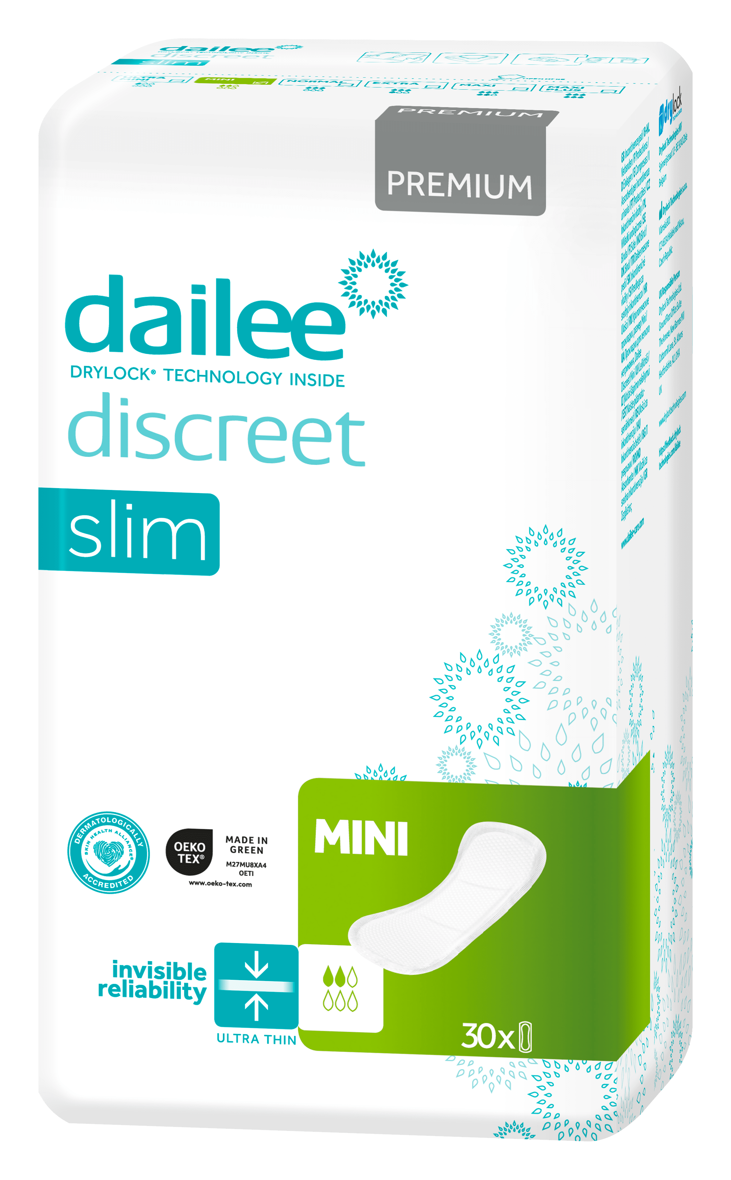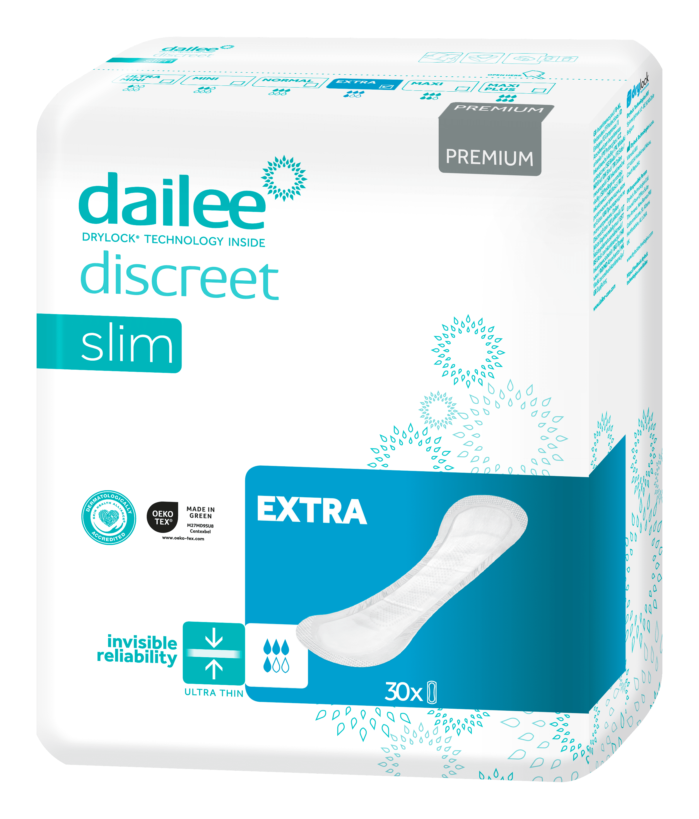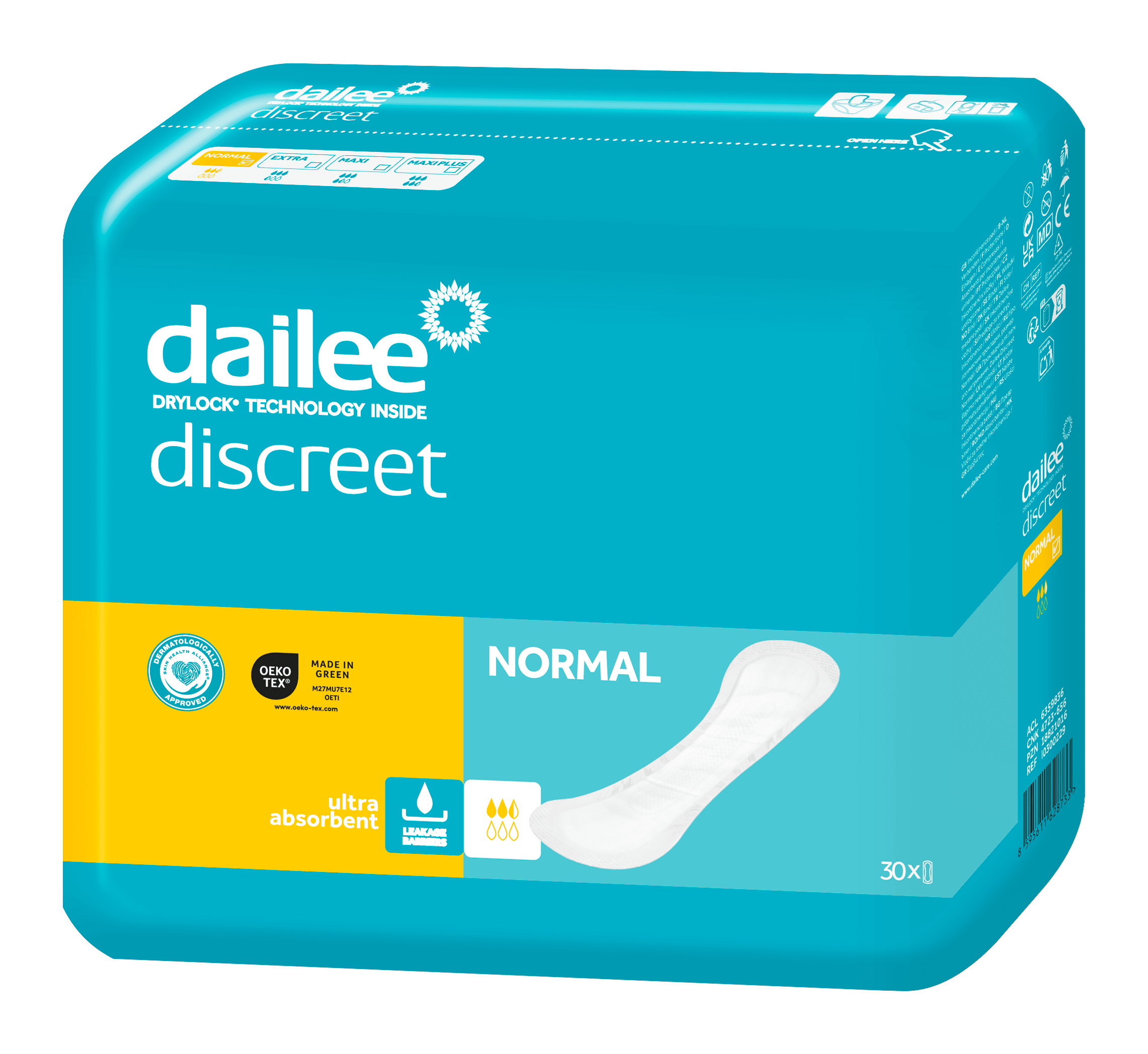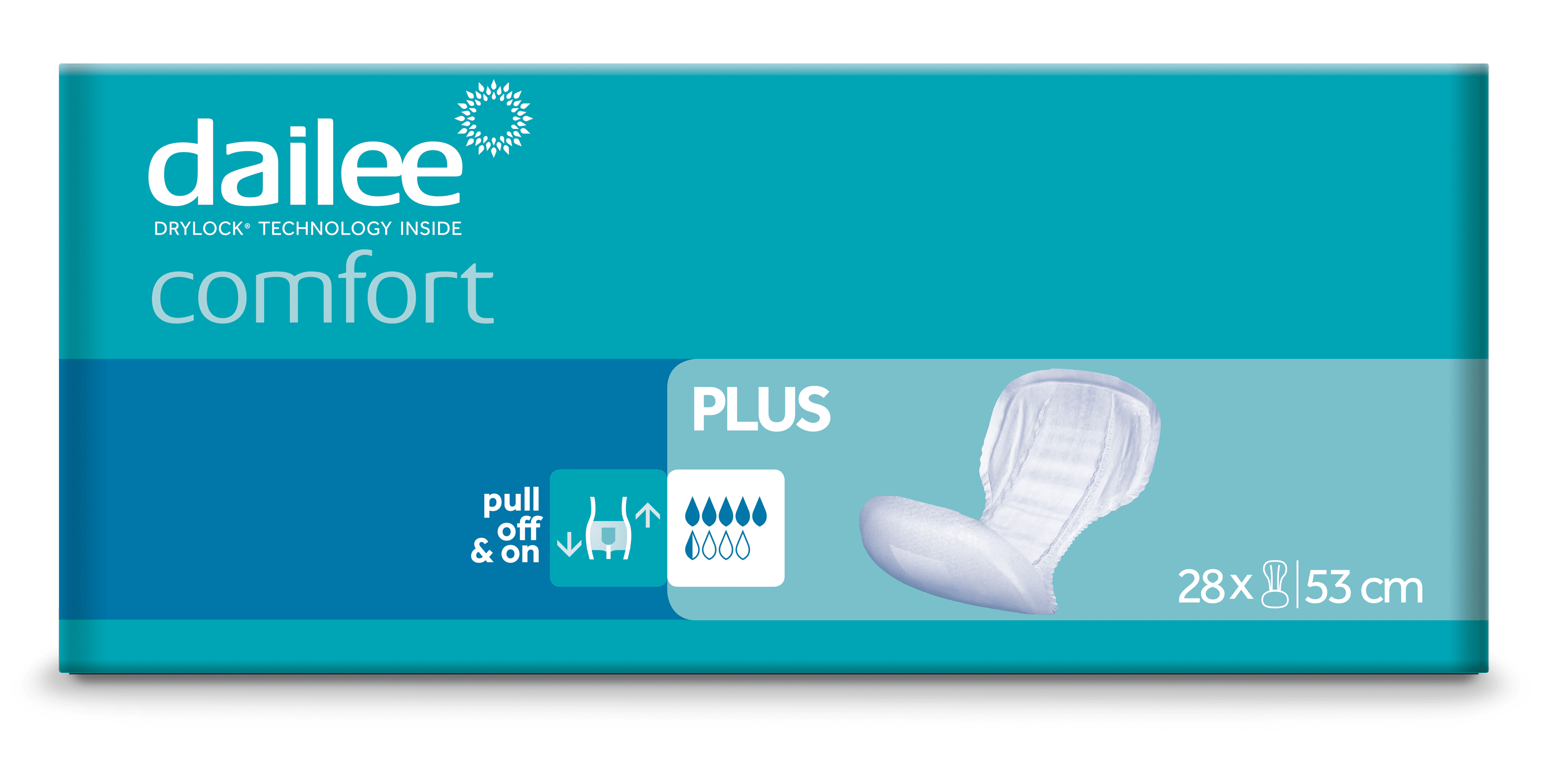 Aktiivsetele, liikuvatele inimestele ja kerge põiepidamatusega rasedatele Mõõdukas kuni raske uriinipidamatus, liikuvatele inimestele Veelgi kõrgem imavus – turvaline valik aktiivsetele inimestele Nahasõbralik Kiire jaotumise ja imavusega kiht, mittekootud pealiskiht Paindlikud lekketõkked parema kaitse tagamiseks, moodustades kausi Lihtne kasutada Turvaline kinnitus laia kleepribaga kogu sideme pikkuses Aktiivne lõhnakontrollisüsteem saavutatakse mitmel viisil, sh orgaanilise lisandi kasutamisega superimavas polümeeris, kuni 12 tundi. Täielikult hingav kaitse soodustab naha tervist Dermatoloogiliselt testitud laboritingimustes vastavalt standardile ISO 10993 DRYLOCK TECHNOLOGIES tooted on toodetud 100% ECOpower abil – EKO Energie keskkonnasertifikaat CO₂-neutraalne tootmise ökomärgis OEKO-TEX „MADE IN GREEN” EL-i poolt tunnustatud ökomärgis ECOVADIS PLATINUM märgis Lateksivaba