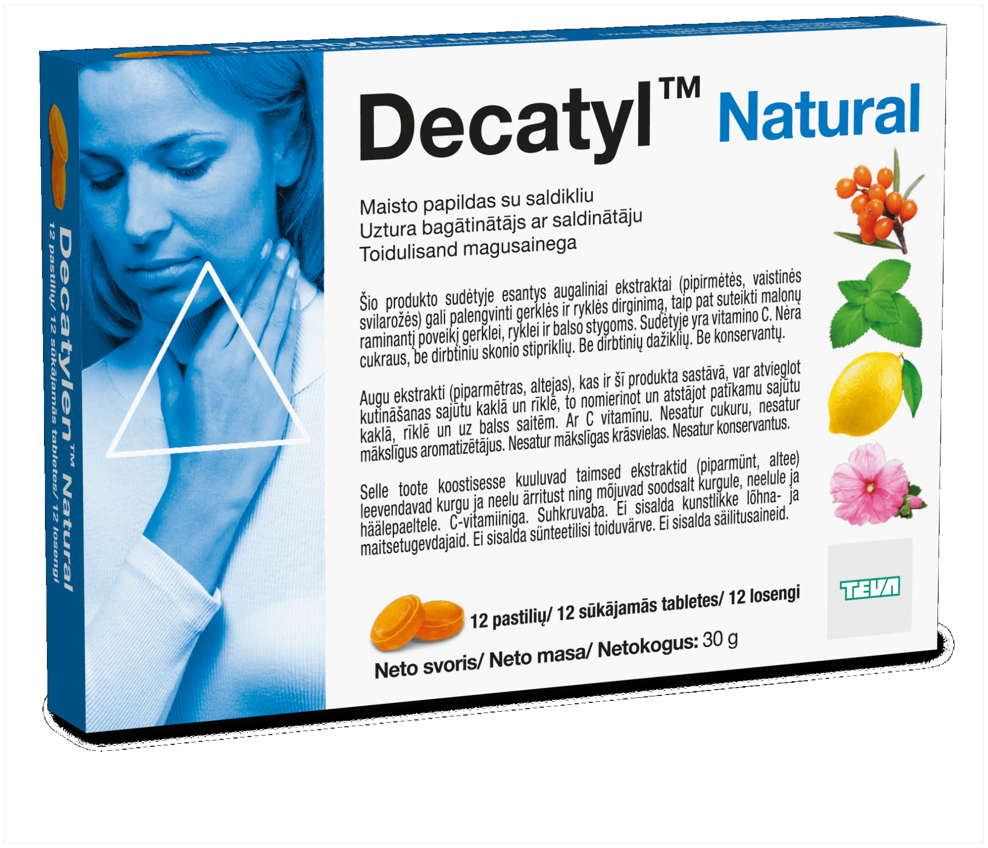 DECATYL Natural losengid sisaldavad looduslikke ekstrakte (astelpaju, sidrun, piparmünt, altee) ja C-vitamiini. Looduslikud ekstraktid aitavad vähendada ärritust kurgus ja neelus ning on samal ajal rahustava toimega häälepaeltele. C-vitamiin toetab immuunsüsteemi normaalset talitlust. Hoiatused: Kasutamiseks 4. aastastele ja vanematele lastele ning täiskasvanutele!Oluline on toituda mitmekülgselt ja tasakaalustatult ning harrastada tervislikku elustiili!Mitte ületada päevaseks tarbimiseks soovitatavat kogust!Toidulisandit mitte kasutada mitmekesise toitumise asendajana!Hoida toodet lastele kättesaamatus kohas!