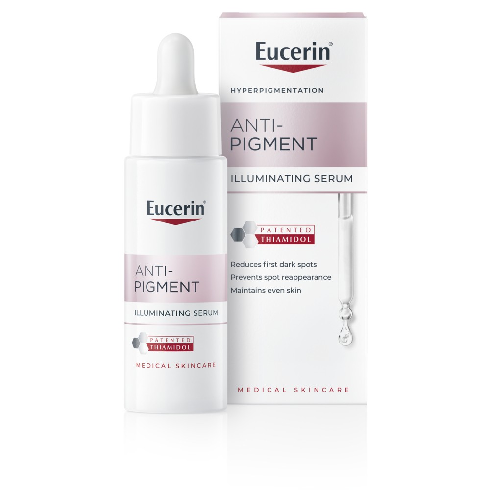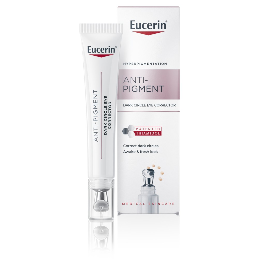 Melaniin on looduslik pigment, mis annab nahale värvi. Kokkupuude päikesevalgusega, hormonaalsed muutused ja vananemine võivad põhjustada melaniini tootmise suurenemist ja vallandada hüperpigmentatsiooni. Hüperpigmentatsioon ilmneb tumedate ringide ja laikudena silmade ümber ning vanaduslaikudena (tuntud ka päikeselaikudena), mis muudavad naha väljanägemise ebaühtlaseks. Eucerin Anti-Pigment silmaümbruskreem tumedatele silmaalustele sisaldab tõhusaid koostisosi, mis toimivad erinevatel viisidel, muutes teie naha säravamaks, vähendades hüperpigmentatsiooni ning tehes teie silmaümbrused heledamaks ja siledamaks. Värskendav ja kerge koostis sisaldab tiamidooli, mis on tõhus ja patenteeritud koostisaine, toimides hüperpigmentatsiooni algpõhjusele ehk vähendades melaniini tootmist. Valgust peegeldavad pigmendid muudavad teie silmaümbrused heledamaks, andes kohe värske ja särava välimuse. Hüaluroonhape vähendab turset ja silub peeneid kortse. Oligopeptiidid stimuleerivad naha kollageenivõrgustikku kindlama nahastruktuuri saavutamiseks. Kreemi saab hõlpsalt ja täpselt kanda hüperpigmentatsiooniga väikestele aladele, kasutades selleks kaasas olevat jahutavat metallist aplikaatorit. Kõigest kahe nädalaga on tulemused silmnähtavad: nahk on siledam, ühtlasem ja elastsem ning värske ja särava välimusega.