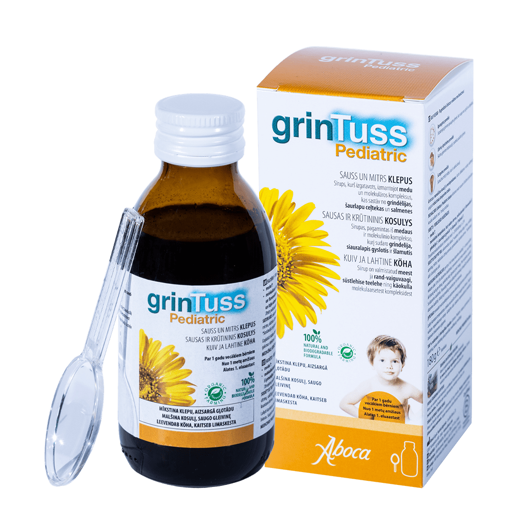 Grintuss Pediatric siirup on meditsiiniseade, mis koosneb taimsest kompleksist Poliresin® ja meest ning toimib kuiva köha faasis, võideldes limaskesta põletiku vastu, ja röga faasis, soodustades röga vedeldamist ja väljutamist ülemistest hingamisteedest.Grintuss Pediatric siirup avaldab ülemistele hingamisteedele kaitsvat, rahustavat ja põletikuvastast füsioloogilist toimet järgmiste toimemehhanismide kaudu:Kaitsev - Moodustab limaskestale kaitsva kile ja kaitseb seda kokkupuute eest ärritajatega.Antioksüdantne - Vähendab limaskesta põletikust tekkivaid vabu radikaale.Lima reguleeriv - Aitab niisutada röga ülemistes hingamisteedes, muutes seda seeläbi vähem viskoosseks ning kergemini eemaldatavaks.Määriv - Köhimise ajal vähendab hõõrdumist kõrikaane ja neelu vahel, neutraliseerides põletikku soodustavat nõiaringi.Niisutav - Aitab säilitada limaskesta terviklikkust ja funktsionaalsust.Grintuss Pediatric siirup muudab köha seda maha surumata, võttes arvesse köha tähtsat rolli hingamisteede kaitsmisel.Näidustused: kuiva ja lahtise köha raviks, nii ägedas faasis kui ka püsiva köha korral.