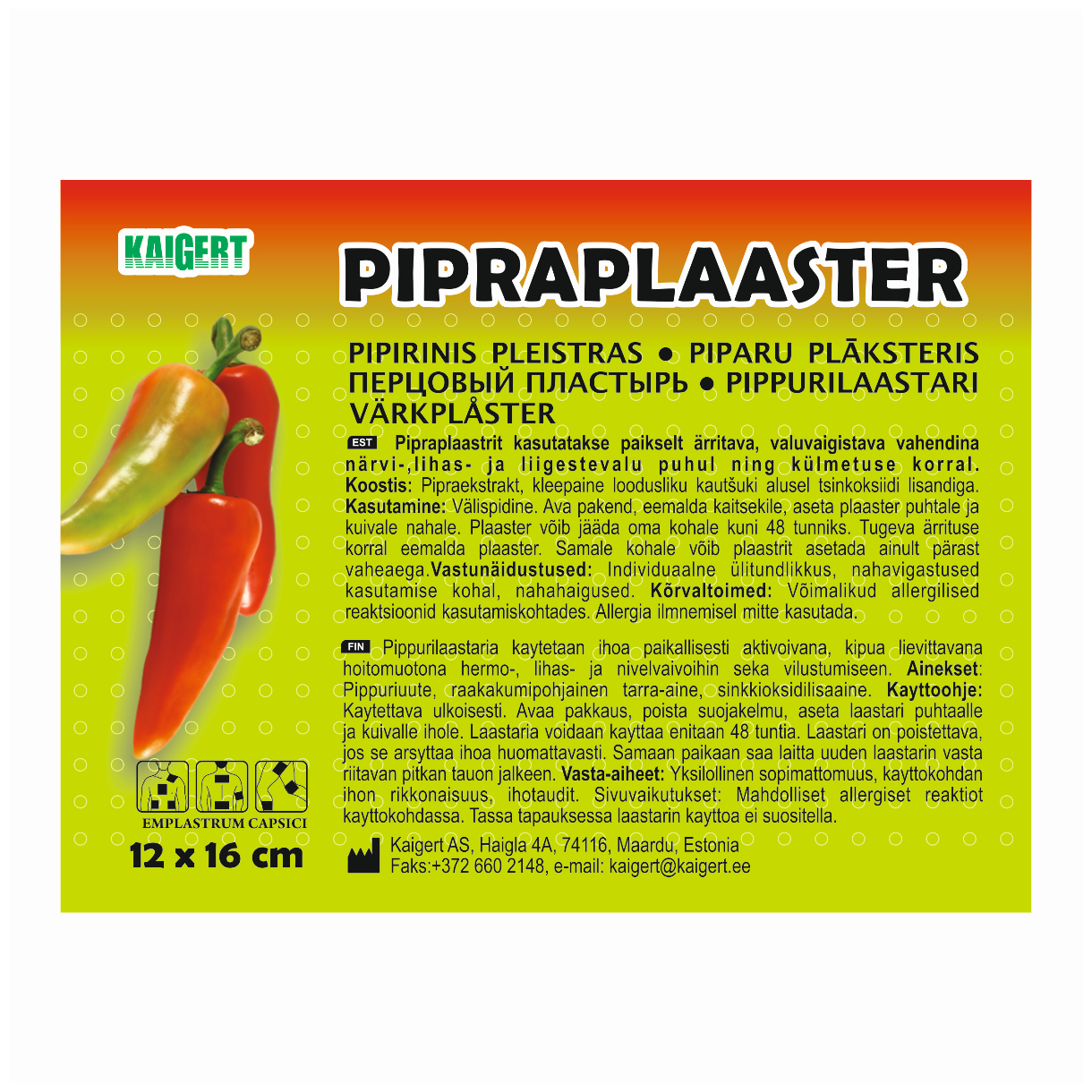 KAIGERT pipraplaastrit kasutatakse paikselt soojendava ja verevarustust soodustava toime tõttu abistava vahendina hingamisteede ja lihasvaevuste korral. Hoiatused: Mitte kasutada kui esineb naha ülitundlikkus, nahakahjustus ja nahahaigused!Võimalik allergiliste reaktsioonide esinemine kasutuspiirkondades!Allergia ilmnemisel eemaldage plaastrid nahalt ja lõpetage toote kasutamine!