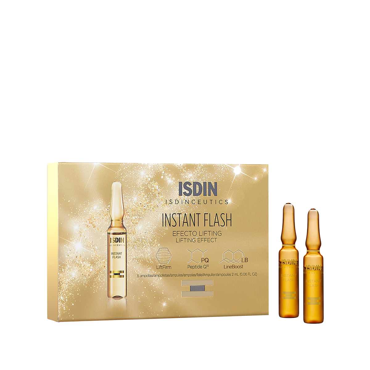 ISDINCEUTICS INSTANT FLASH ampullid on kombinatsioon aktiivainetest, mis soodustavad kohest ja pikemaajalist nahka pinguldavat efekti, andes näole koheselt noorema väljanägemise. Aktiivsed toimeained: LiftFirm: tõhustab tänu kiirele toimele kohest ja pikaajalist pinguldavat mõju ning aitab vähendada kortse ja miimikakurde. Peptiid Q10: ergutab näonahka, kaotades väsimuse ja stressi märgid, mille tulemuseks on siledam nahk. LineBoost: vananemisvastase ja niisutava toimega koostisainete segu, mis muudab näo nähtavalt nooremaks. Dermatoloogiliselt testitud ja õlivaba näolahus.